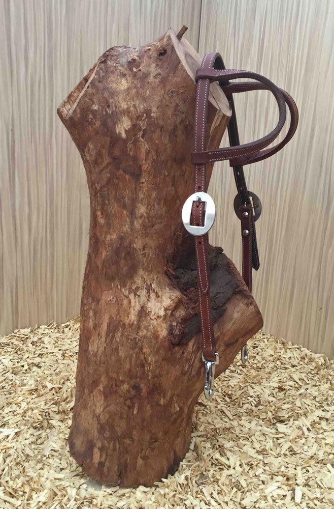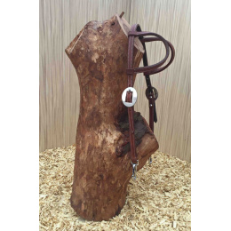 Kožená uzdečka na dvě uši se zdvojenými náušníky a nerezovým kováním. Podšitá jemnou telecí kůží, ozdobné prošití po obvodu.
