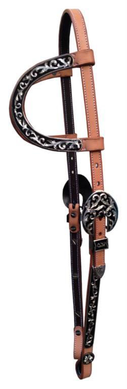 Kožená show uzdečka na dvě uši zdobená stříbrným gravírováním a přezkami. Podšitá jemnou telecí kůží, ozdobné prošití po obvodu.