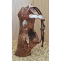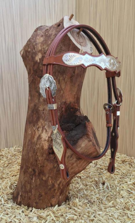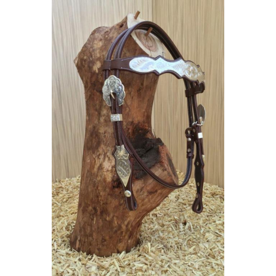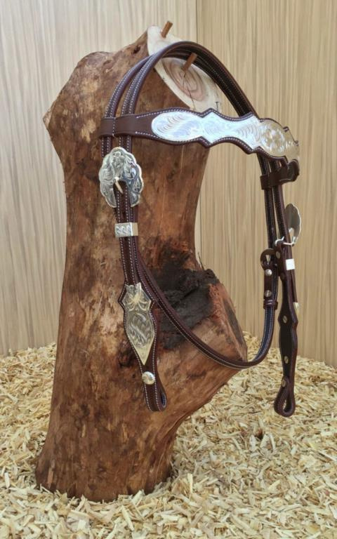 Kožená show uzdečka s čelenkou zdobená stříbrným gravírováním a kováním. Podšitá jemnou telecí kůží, ozdobné prošití po obvodu.