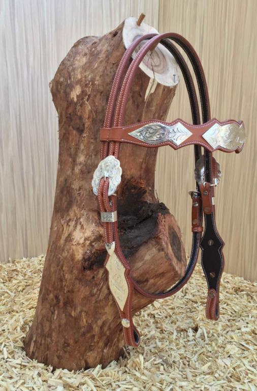 Kožená show uzdečka s čelenkou zdobená stříbrným gravírováním a kováním. Podšitá jemnou telecí kůží, ozdobné prošití po obvodu.