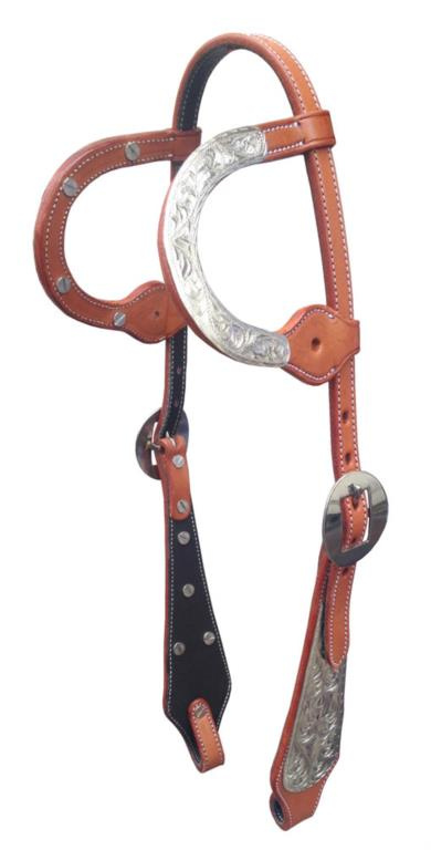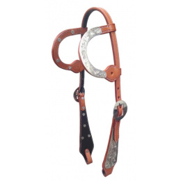 Kožená show uzdečka na dvě uši z vysoce kvalitní kůže Sadesa zdobená stříbrným gravírovaným. Podšitá jemnou telecí kůží, ozdobné prošití po obvodu.