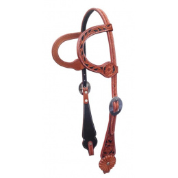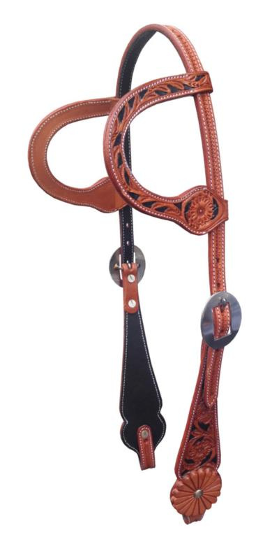 Kožená dvoubarevná show uzdečka na dvě uši zdobená květinovým vzorem. Podšitá jemnou telecí kůží, ozdobné prošití po obvodu.