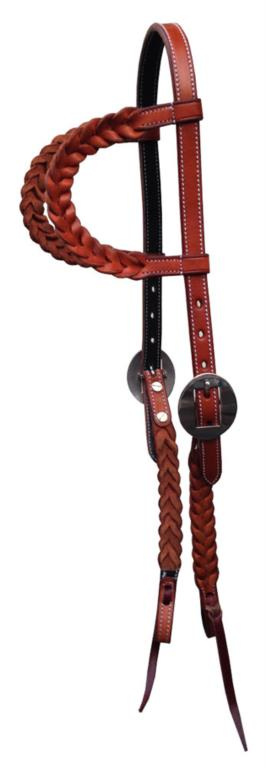Kožená uzdečka na dvě uši s pletenými náušníky a nálicníky. Podšitá jemnou telecí kůží, ozdobné prošití po obvodu.