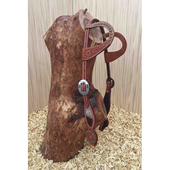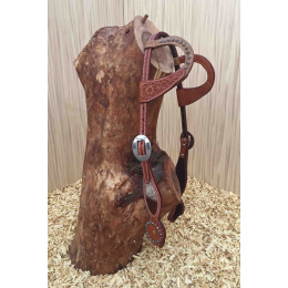 Kožená uzdečka na dvě uši zdobená květinovým vzorem, "chlupatou" kůží a stříbrnými nýtky. Podšitá jemnou telecí kůží, ozdobné prošití po obvodu.