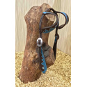 Kožená dvoubarevná uzdečka na dvě uši zdobená stříbrnými nýtky. Podšitá jemnou telecí kůží, ozdobné prošití po obvodu.