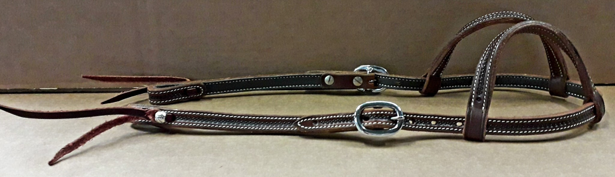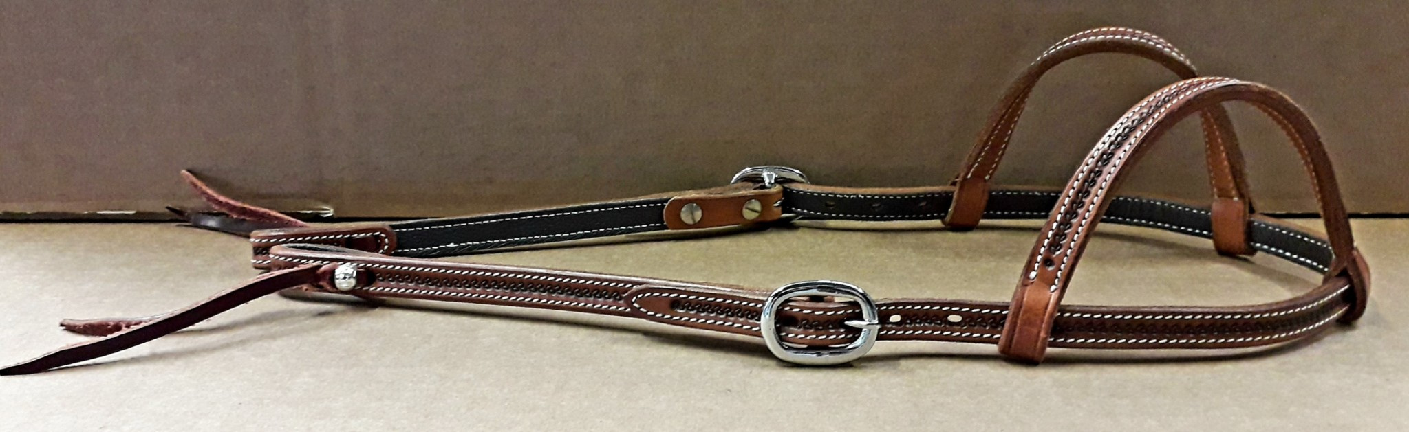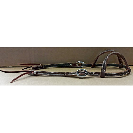 Kožená uzdečka na dvě uši zdobená vytlačeným vzorem a chromovanou přezkou. Podšitá jemnou telecí kůží, ozdobné prošití po obvodu.