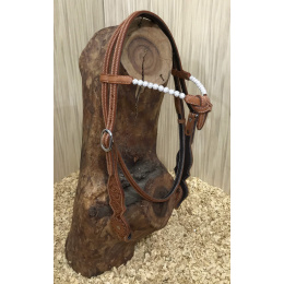 Kožená uzdečka s čelenkou zdobenou stříbrnými kuličkami. Podšitá jemnou telecí kůží, ozdobné prošití po obvodu.