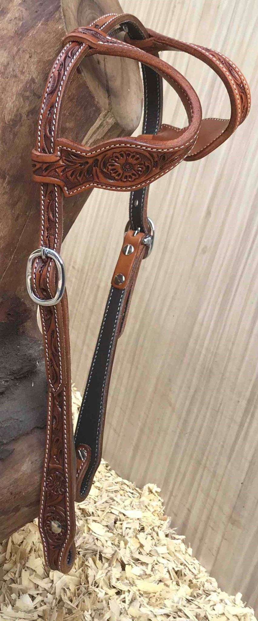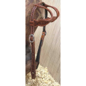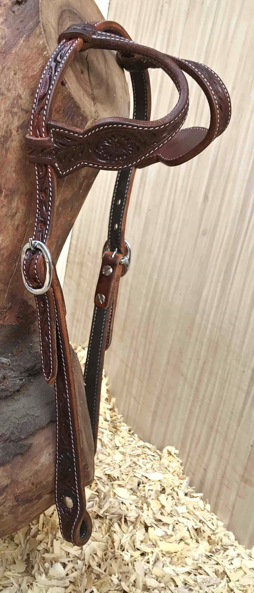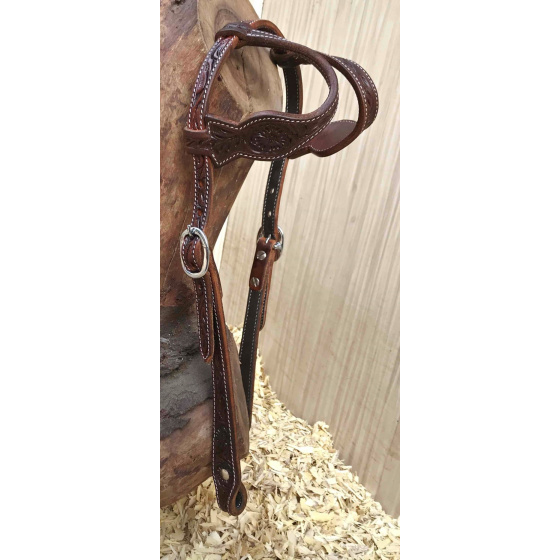 Kožená uzdečka na dvě uši zdobená vytlačeným vzorem. Podšitá jemnou telecí kůží, ozdobné prošití po obvodu.