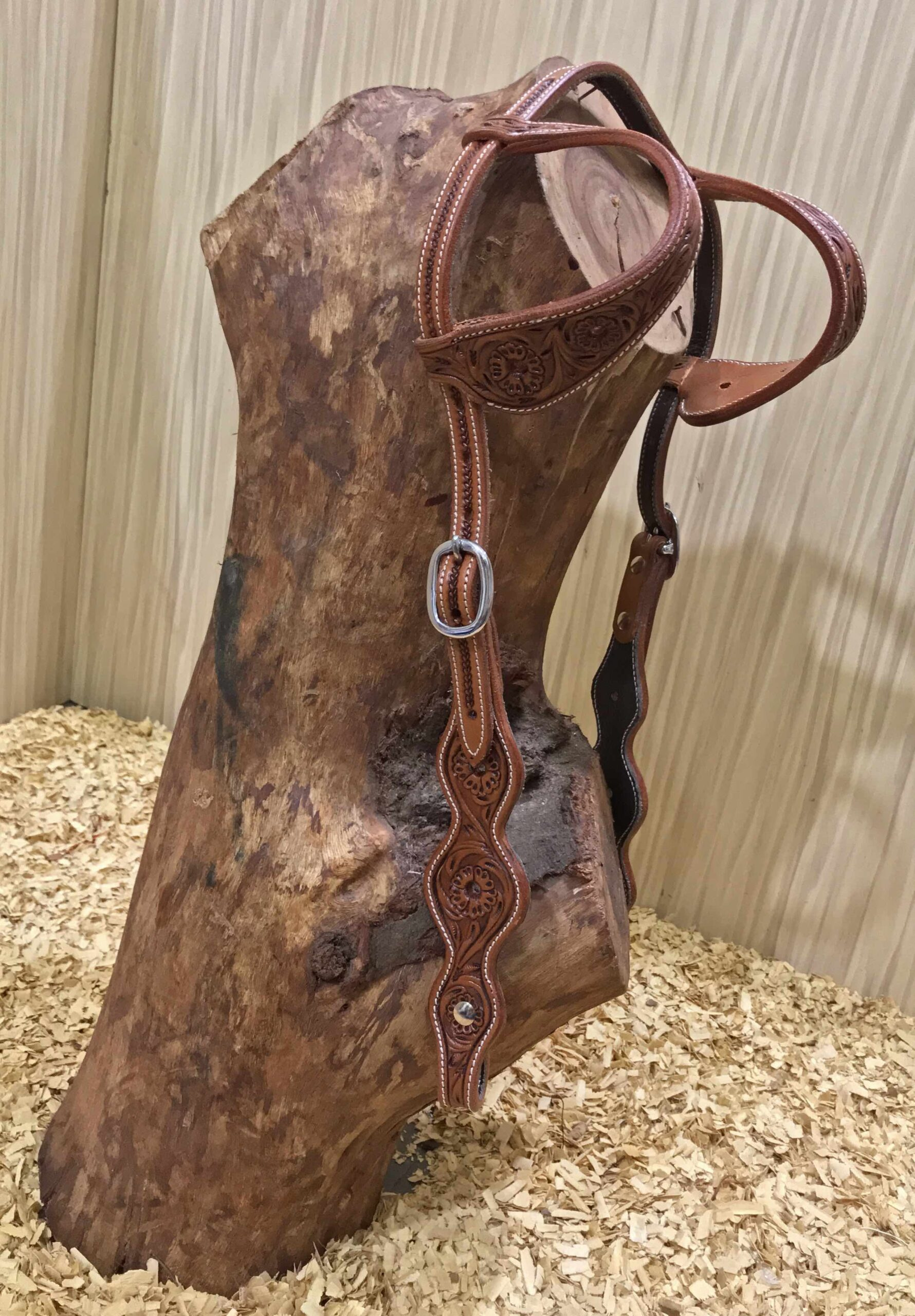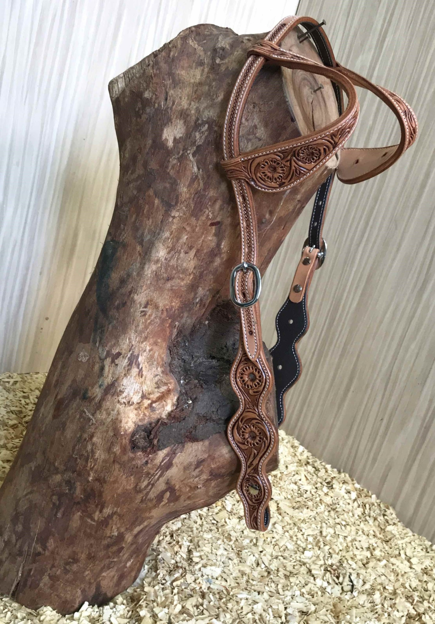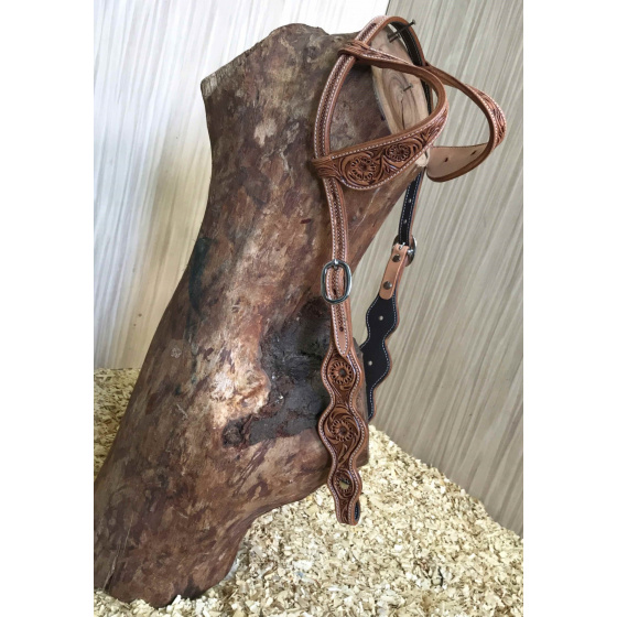 Kožená uzdečka na dvě uši zdobená vytlačeným vzorem, díra pro možnost přichycení konča. Podšitá jemnou telecí kůží, ozdobné prošití po obvodu.