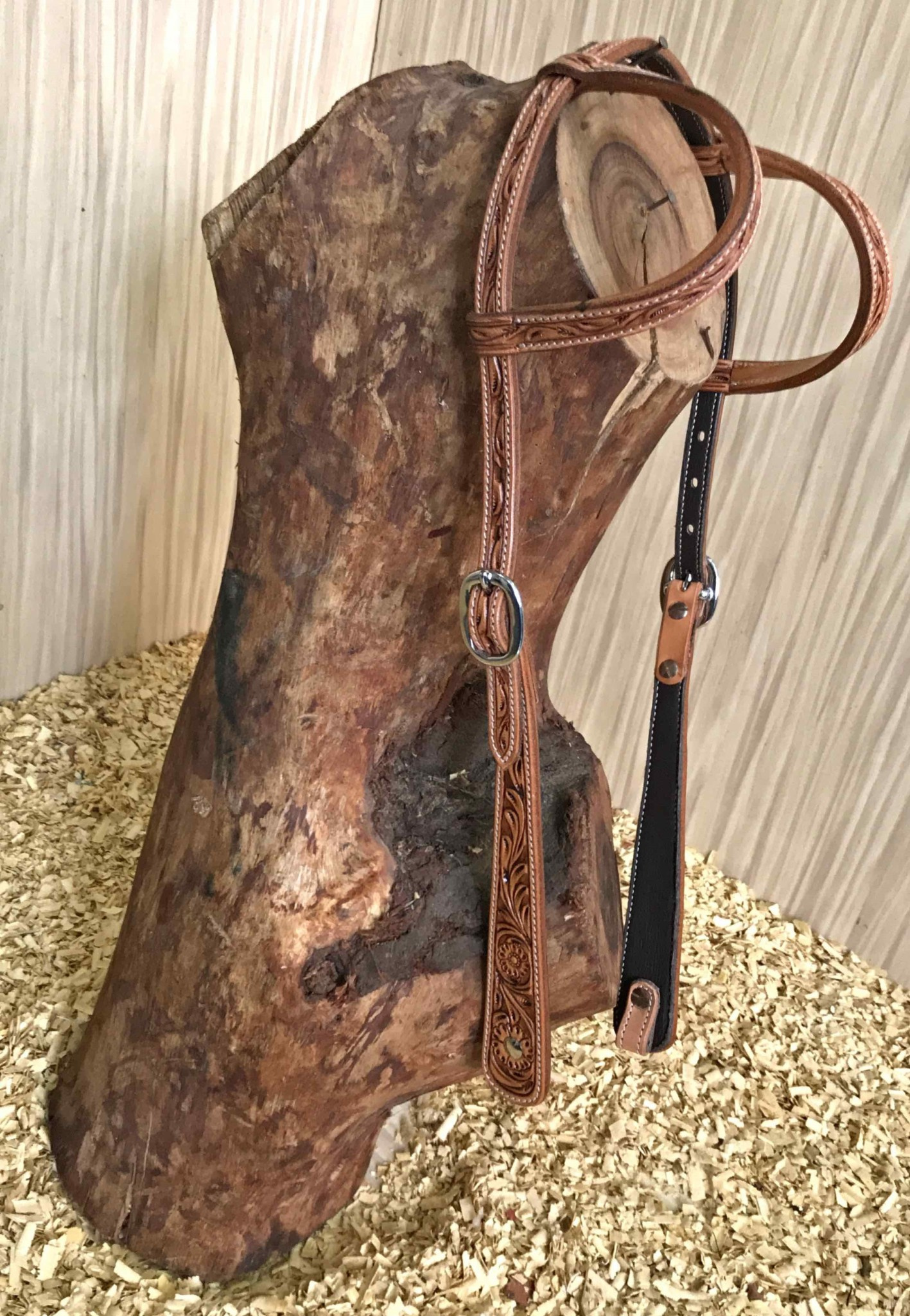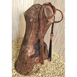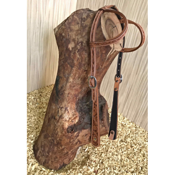 Kožená uzdečka na dvě uši zdobená vytlačeným vzorem. Podšitá jemnou telecí kůží, ozdobné prošití po obvodu.