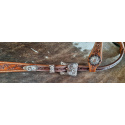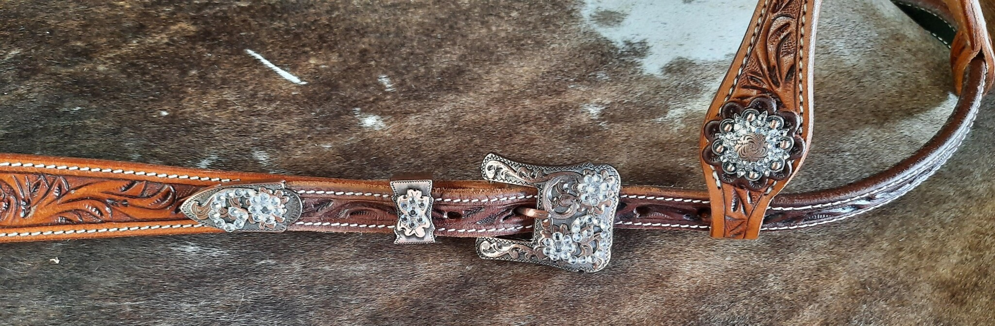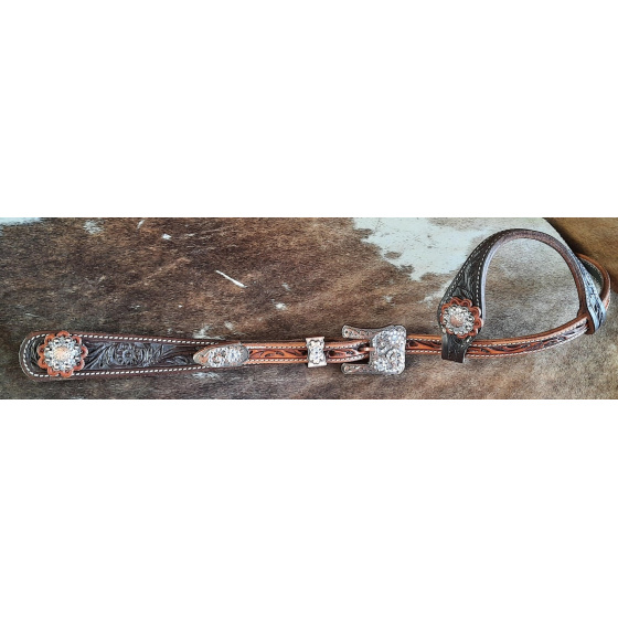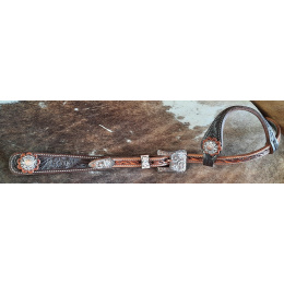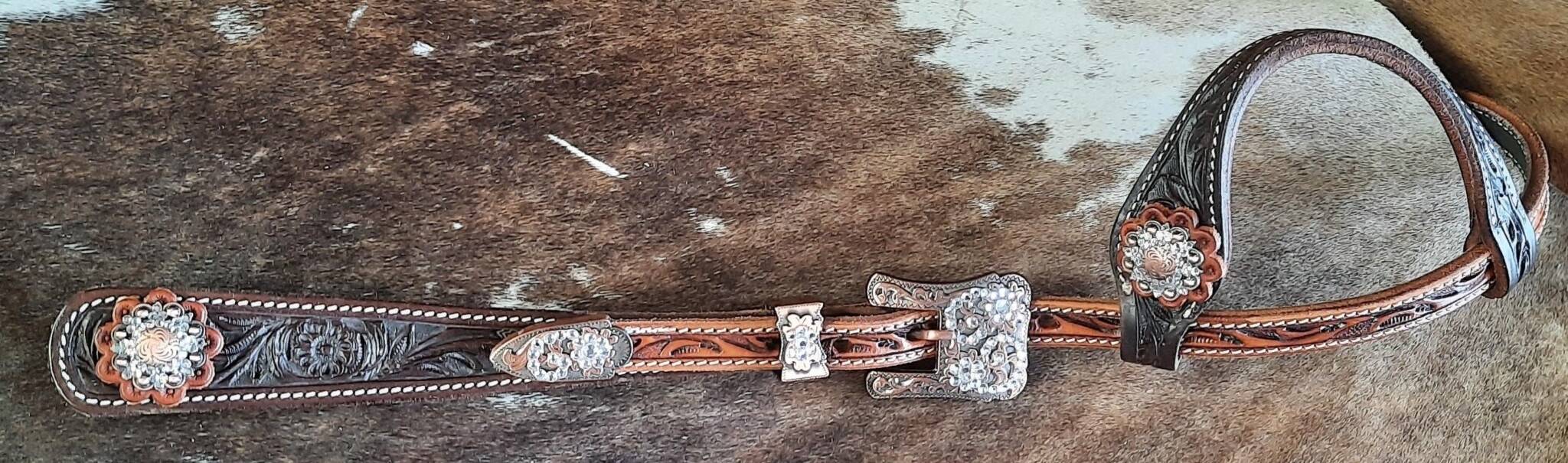 Kožená show uzdečka na dvě uši v antik nádechu zdobená vytlačenými květinovým vzorem, končakem a přezkami "Copper white". Podšitá jemnou telecí kůží, ozdobné prošití po obvodu.