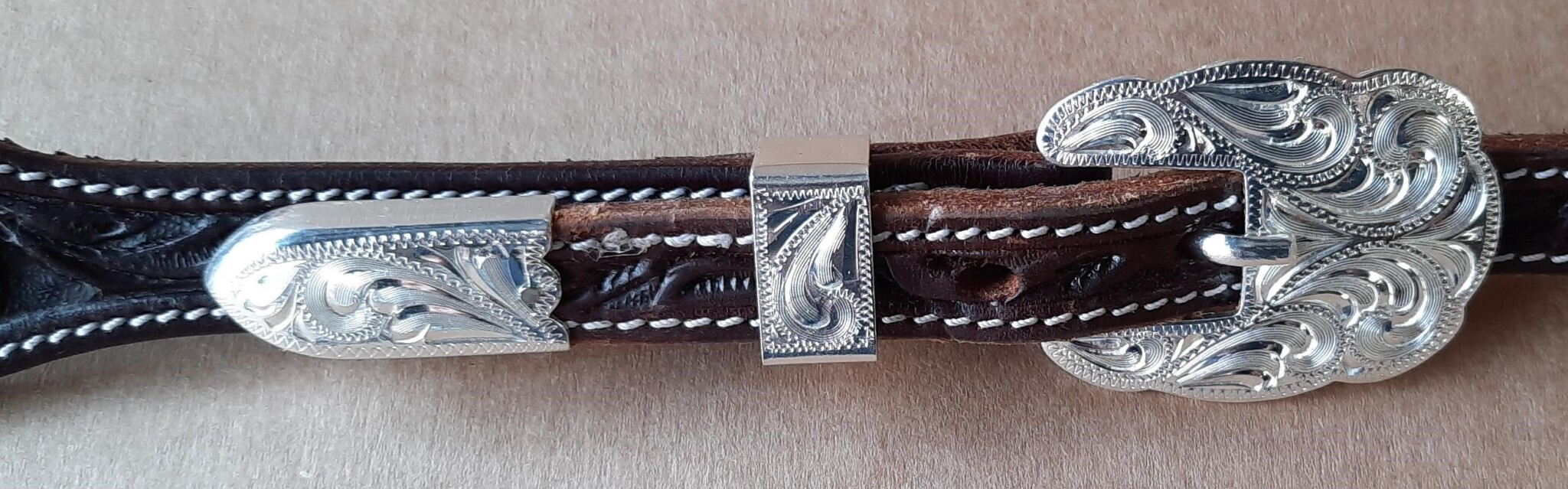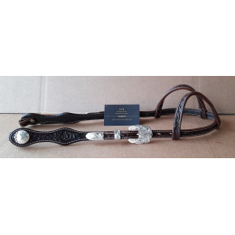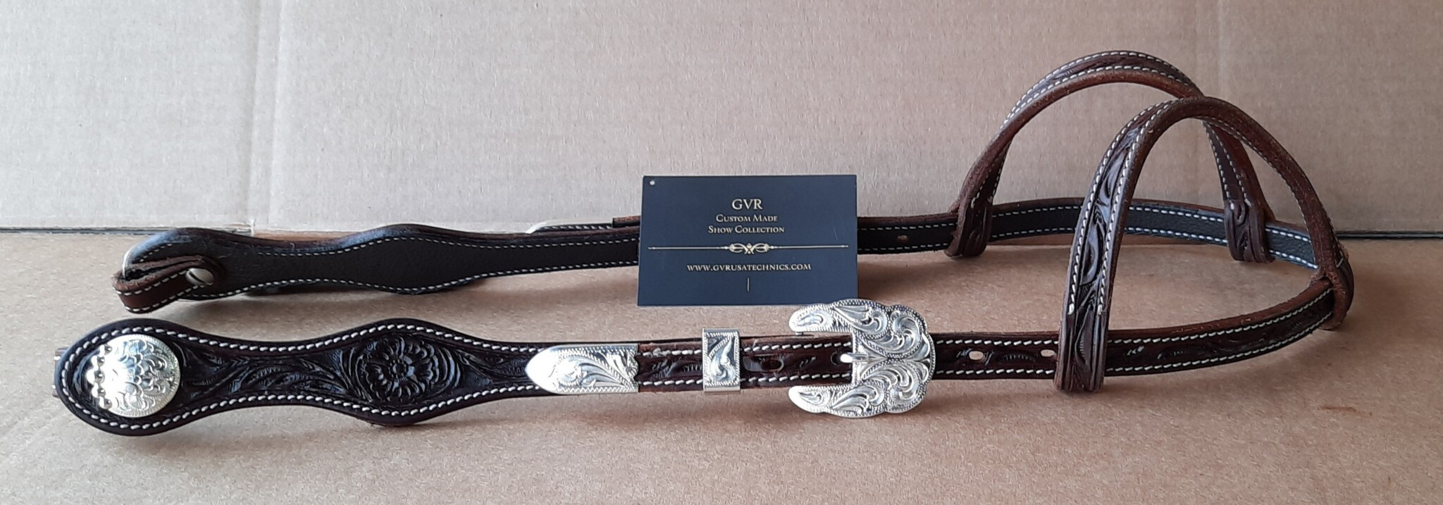 Kožená show uzdečka na dvě uši v antik nádechu zdobená vytlačenými květinovým vzorem, končakem "Manzanillo" a přezkami "Hansen silver Tonopah". Podšitá jemnou telecí kůží, ozdobné prošití po obvodu.