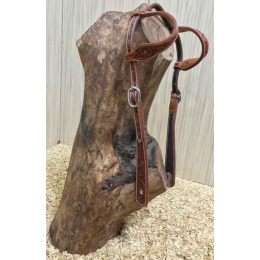 Kožená uzdečka na dvě uši zdobená vytlačeným vzorem a s dírou pro připevnění konča. Podšitá jemnou telecí kůží, ozdobné prošití po obvodu.