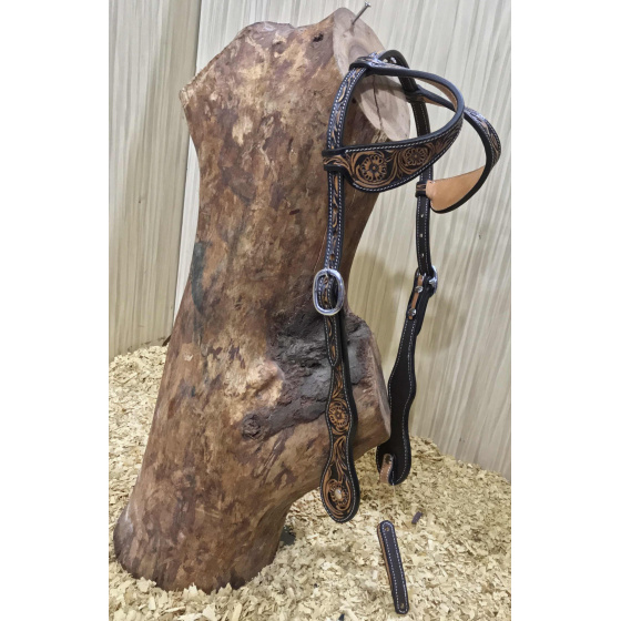 Kožená uzdečka na dvě uši v dvoubarevném provedení zdobená vytlačeným květinovým vzorem. Podšitá jemnou telecí kůží, ozdobné prošití po obvodu.
