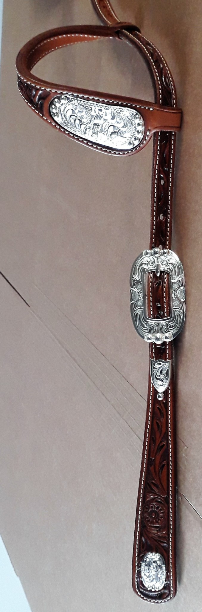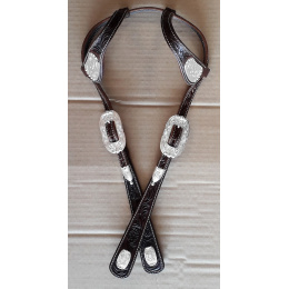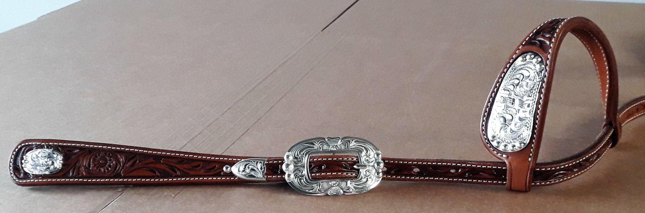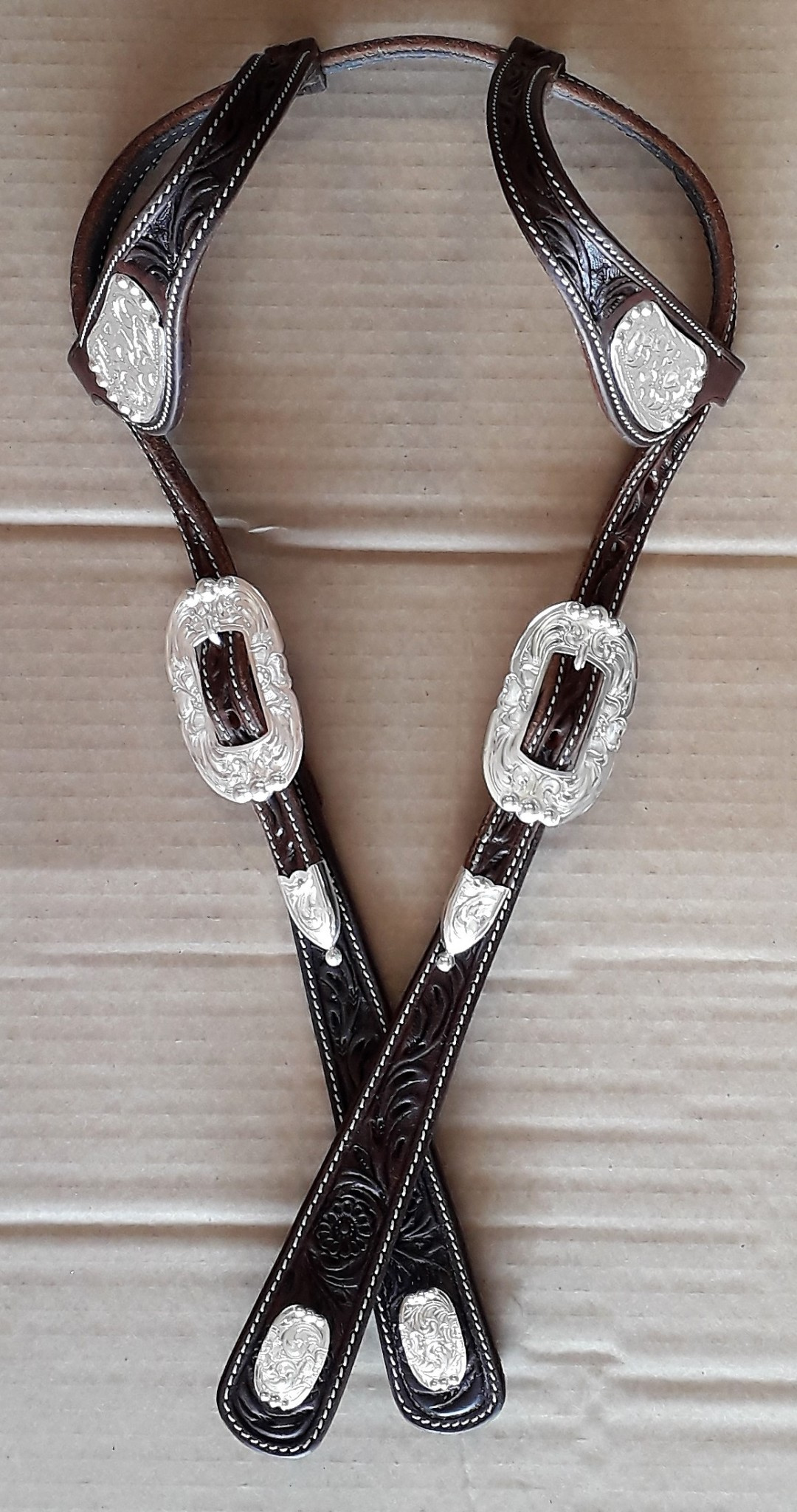 Kožená show uzdečka na dvě uši zdobená vytlačenými květinovým vzorem, končakem a přezkami "Hansen silver Zuni". Podšitá jemnou telecí kůží, ozdobné prošití po obvodu.