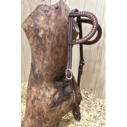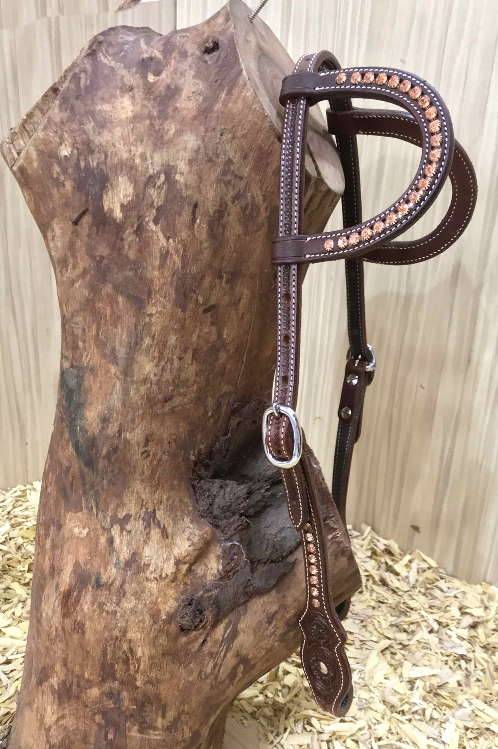 Kožená uzdečka na dvě uši zdobená vytlačeným květinovým vzorem a krystaly v měděném odstínu. Podšitá jemnou telecí kůží, ozdobné prošití po obvodu.