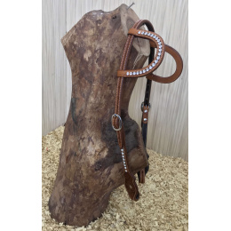 Kožená uzdečka na dvě uši zdobená vytlačeným květinovým vzorem a bílými krystaly. Podšitá jemnou telecí kůží, ozdobné prošití po obvodu.