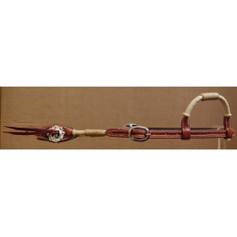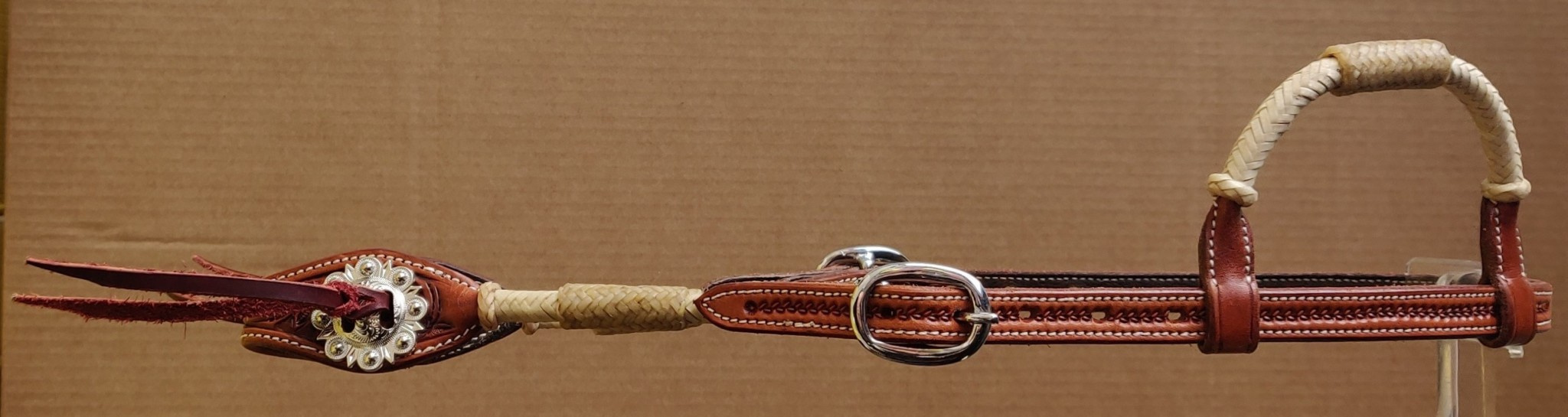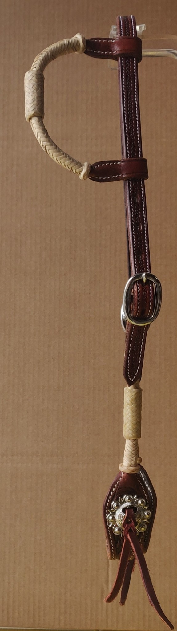 Kožená uzdečka na jedno ucho, přírodní opletení, stříbrné končaky. Podšitá jemnou telecí kůží, ozdobné prošití po obvodu.