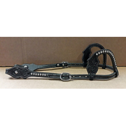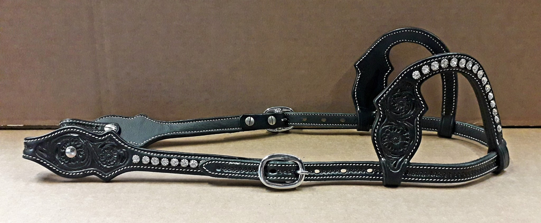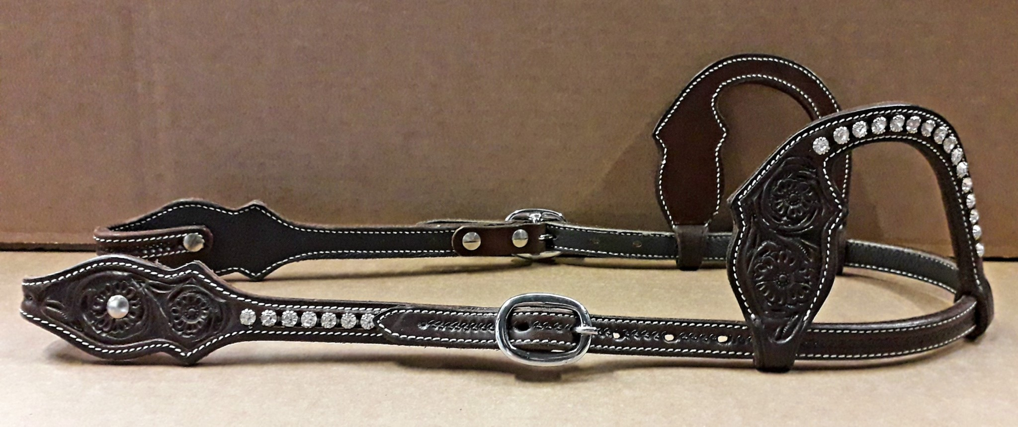 Kožená uzdečka na dvě uši zdobená vytlačeným květinovým vzorem a bílými krystaly. Podšitá jemnou telecí kůží, ozdobné prošití po obvodu.