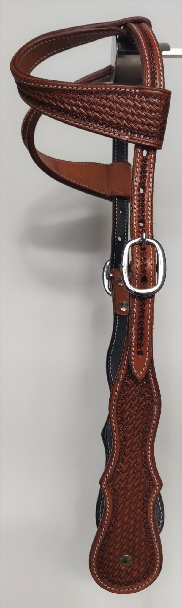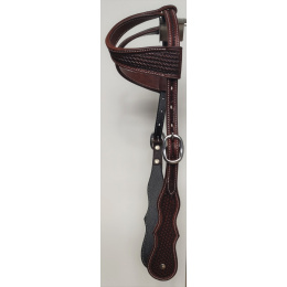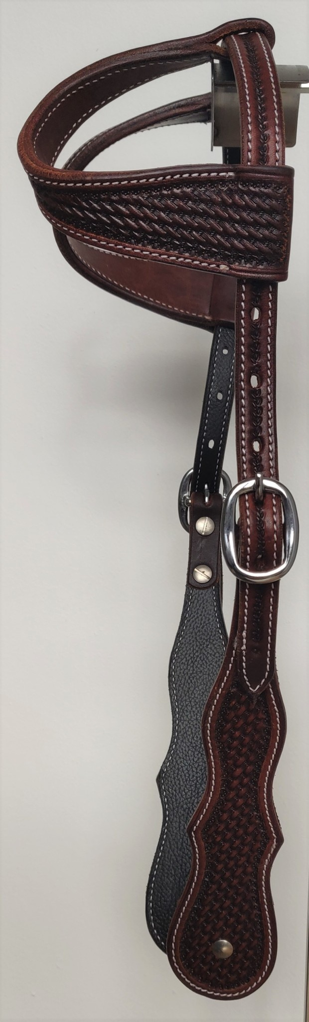 Kožená uzdečka na dvě uši zdobená basketem. Podšitá jemnou telecí kůží, ozdobné prošití po obvodu.