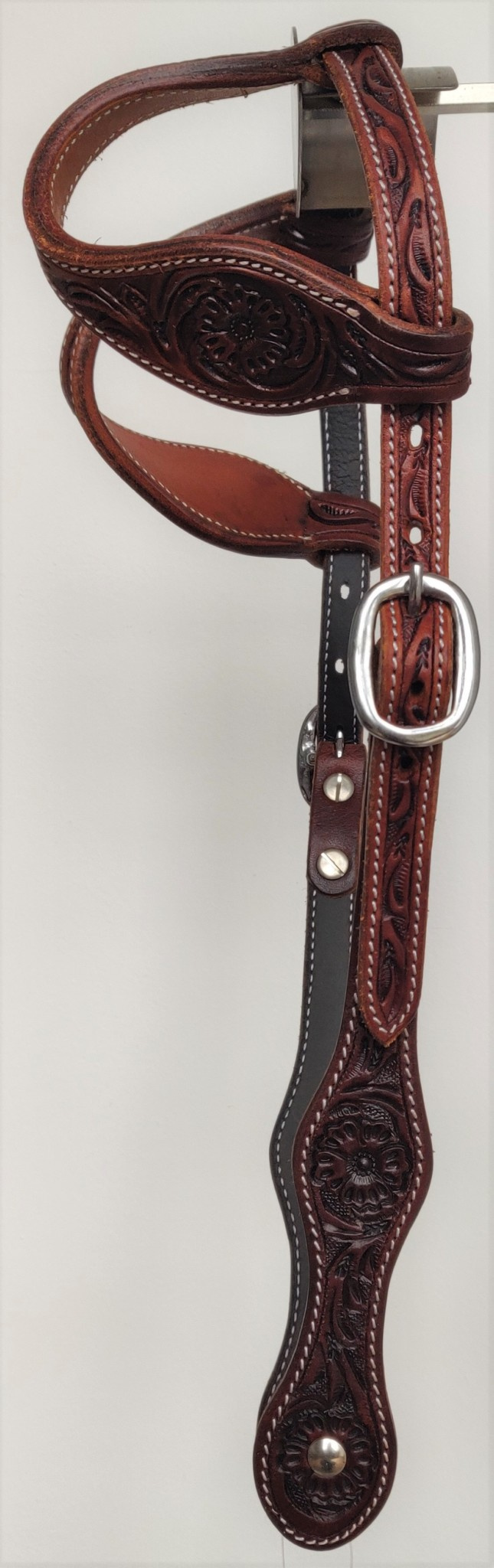 Kožená uzdečka na dvě uši zdobená květinovým vzorem. Podšitá jemnou telecí kůží, ozdobné prošití po obvodu.