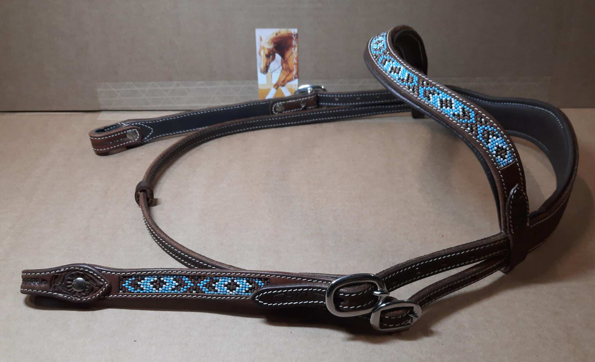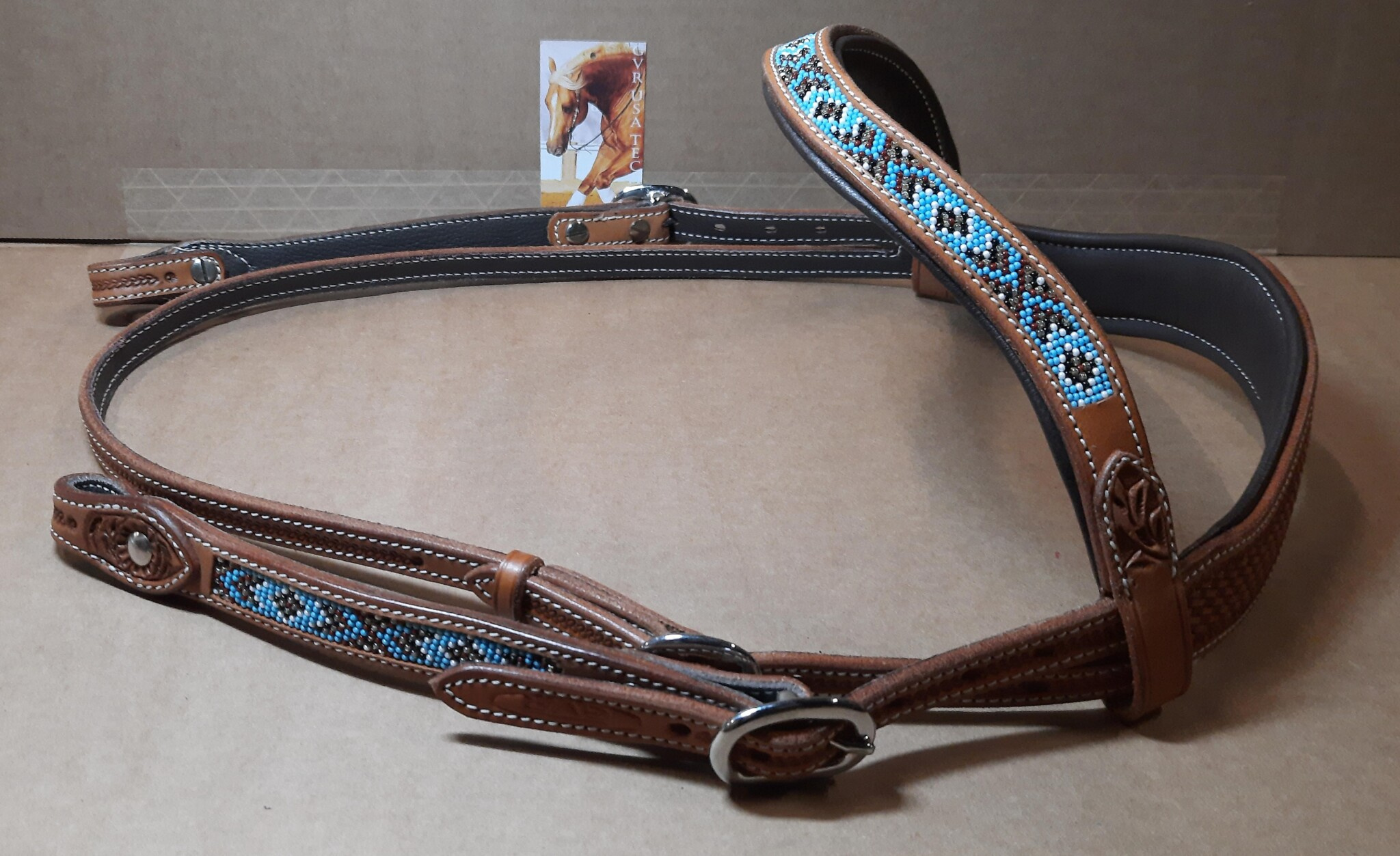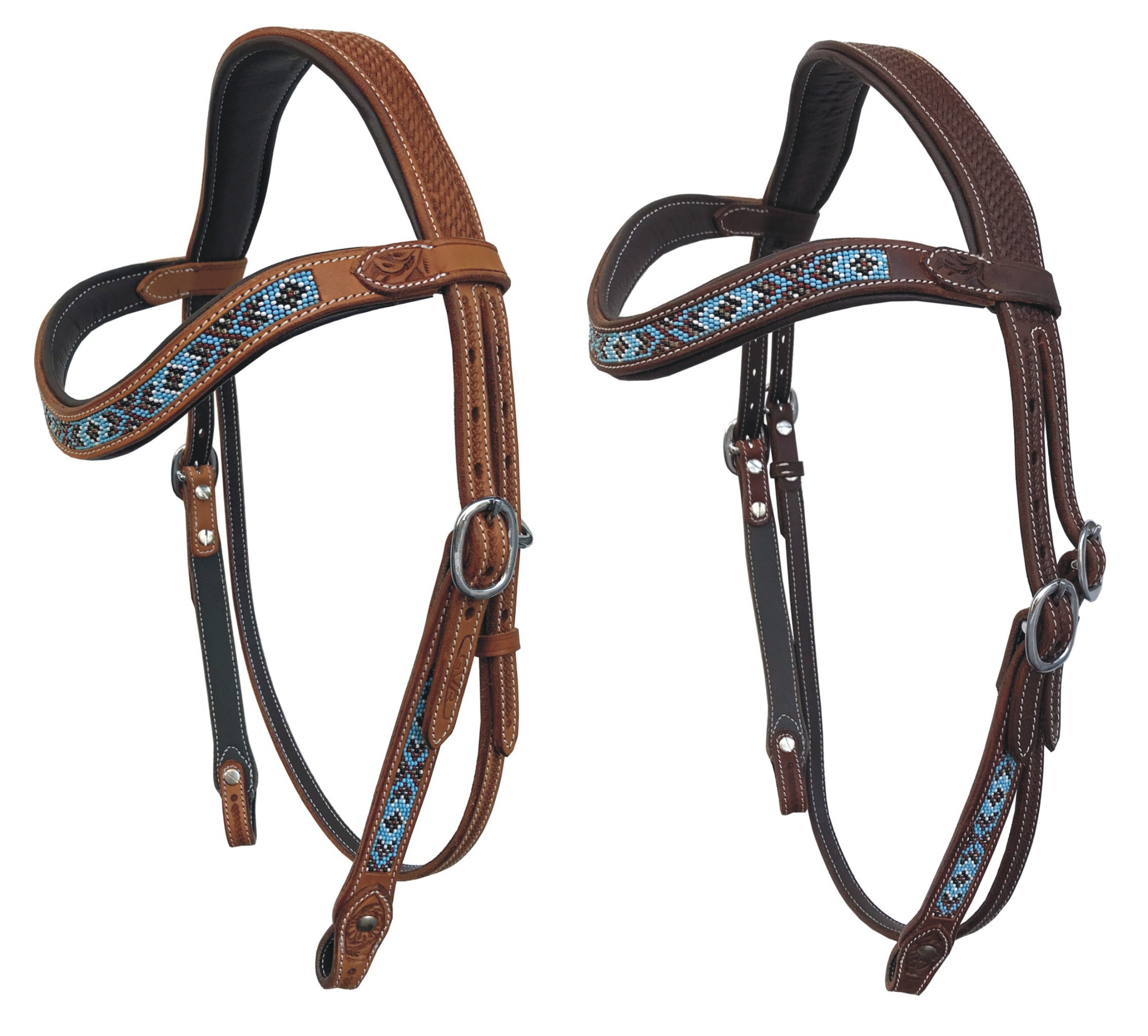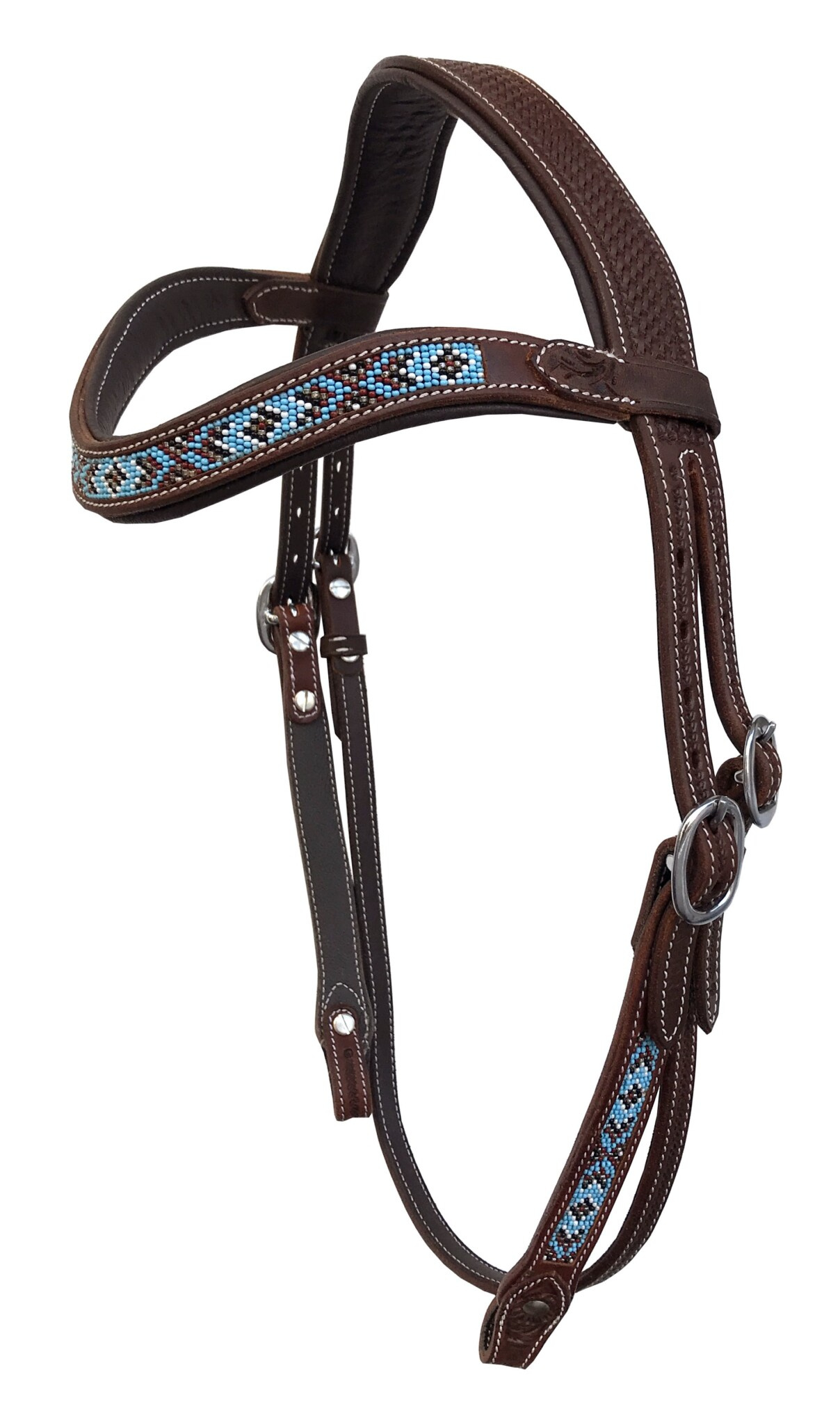 Kožená uzdečka s čelenkou zdobená korálky v aztéckém vzoru a jemným basketem, ergonomicky tvarovaná koruna. Podšitá jemnou telecí kůží, ozdobné prošití po obvodu.