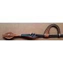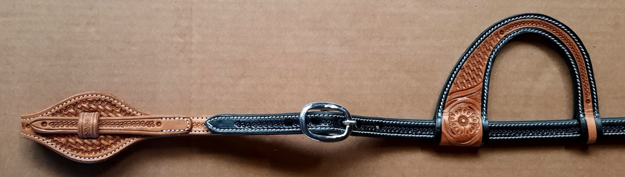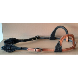 Kožená uzdečka na dvě uši zdobená vytlačeným vzorem, dvoubarevná kombinace černá-russet. Podšitá jemnou telecí kůží, ozdobné prošití po obvodu.