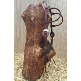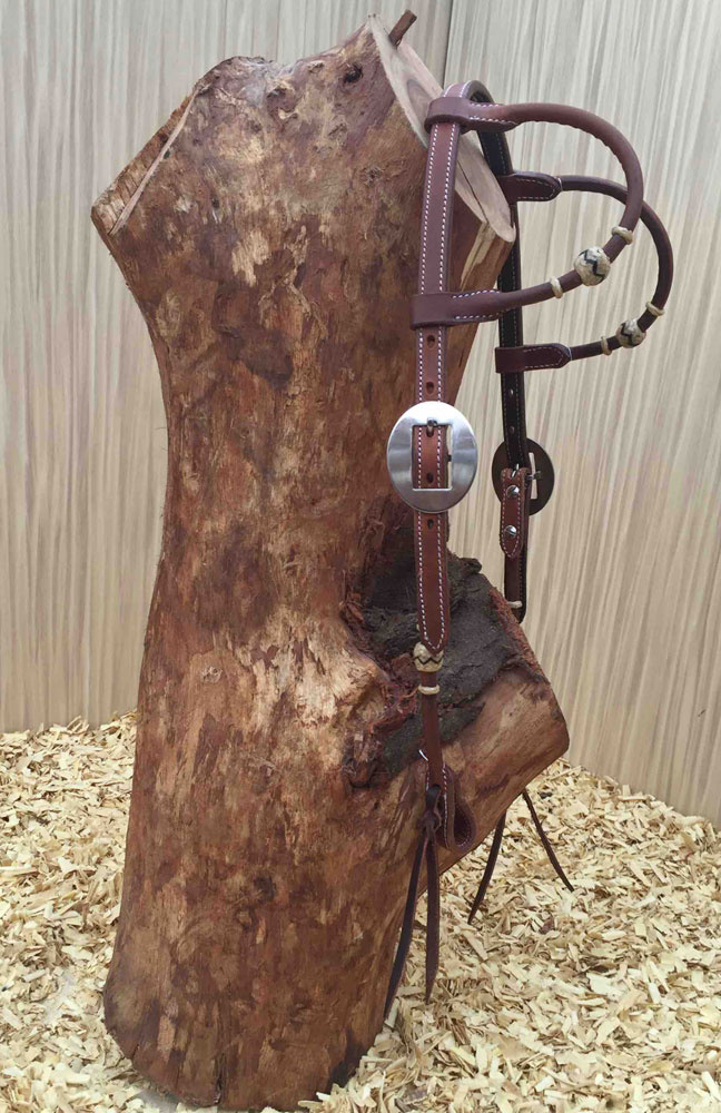 Kožená uzdečka na dvě uši zdobená opletením z žíní. Podšitá jemnou telecí kůží, ozdobné prošití po obvodu.