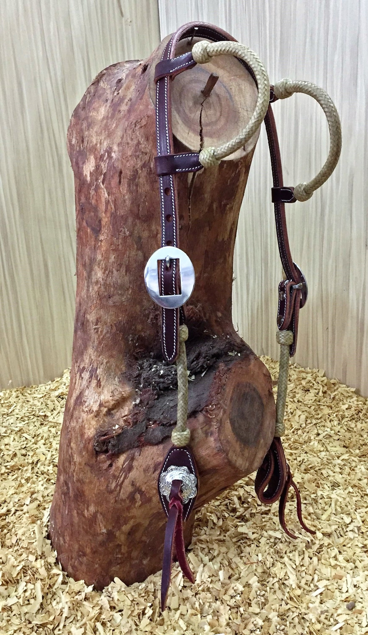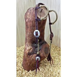 Kožená uzdečka na dvě uši, náušníky pletené Buckaroo, zdobená stříbrným končakem. Podšitá jemnou telecí kůží, ozdobné prošití po obvodu.