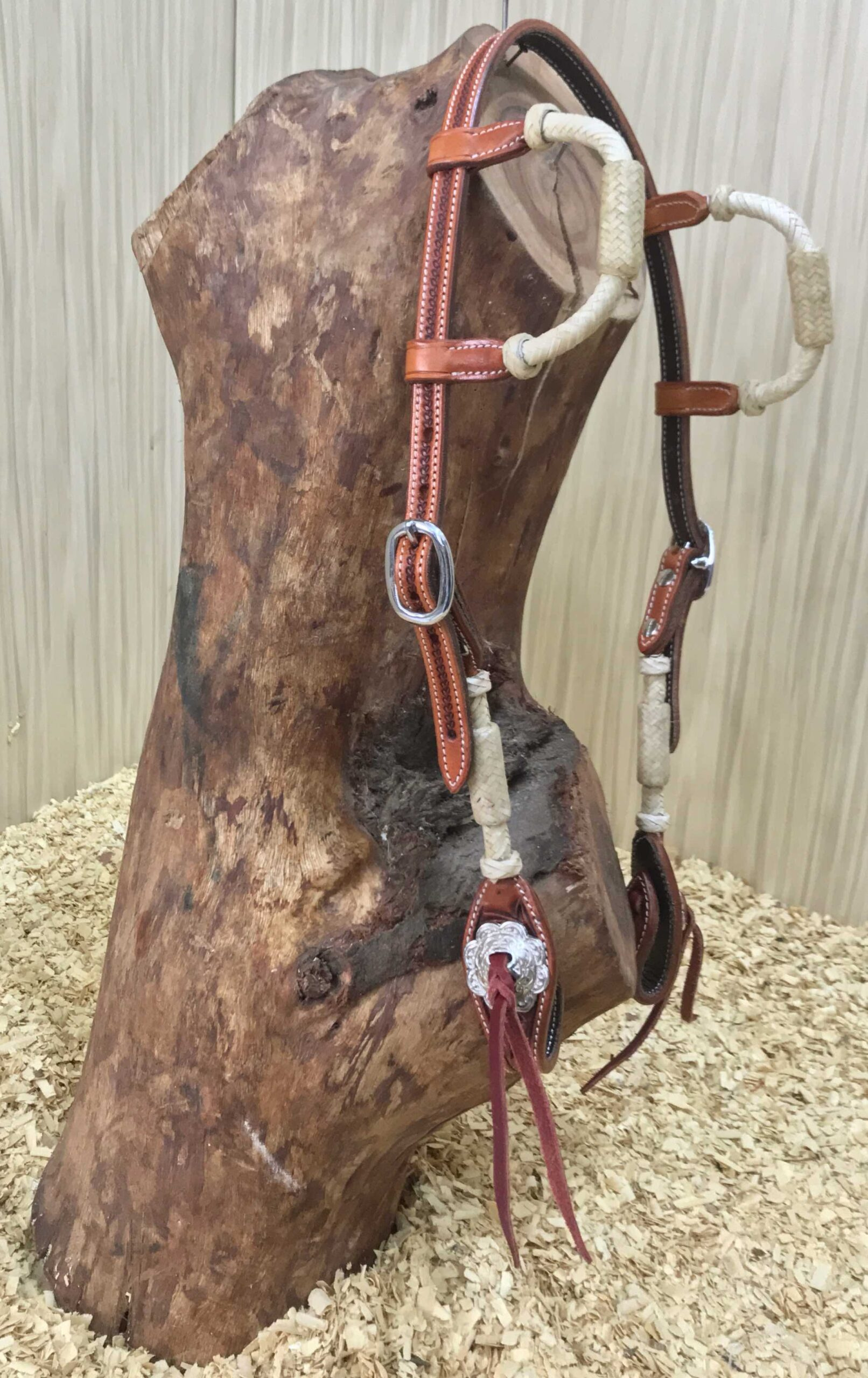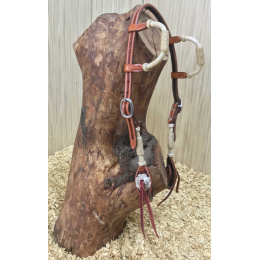 Kožená uzdečka na dvě uši zdobená stříbrnými končaky, opletení Buckaroo. Podšitá jemnou telecí kůží, ozdobné prošití po obvodu.