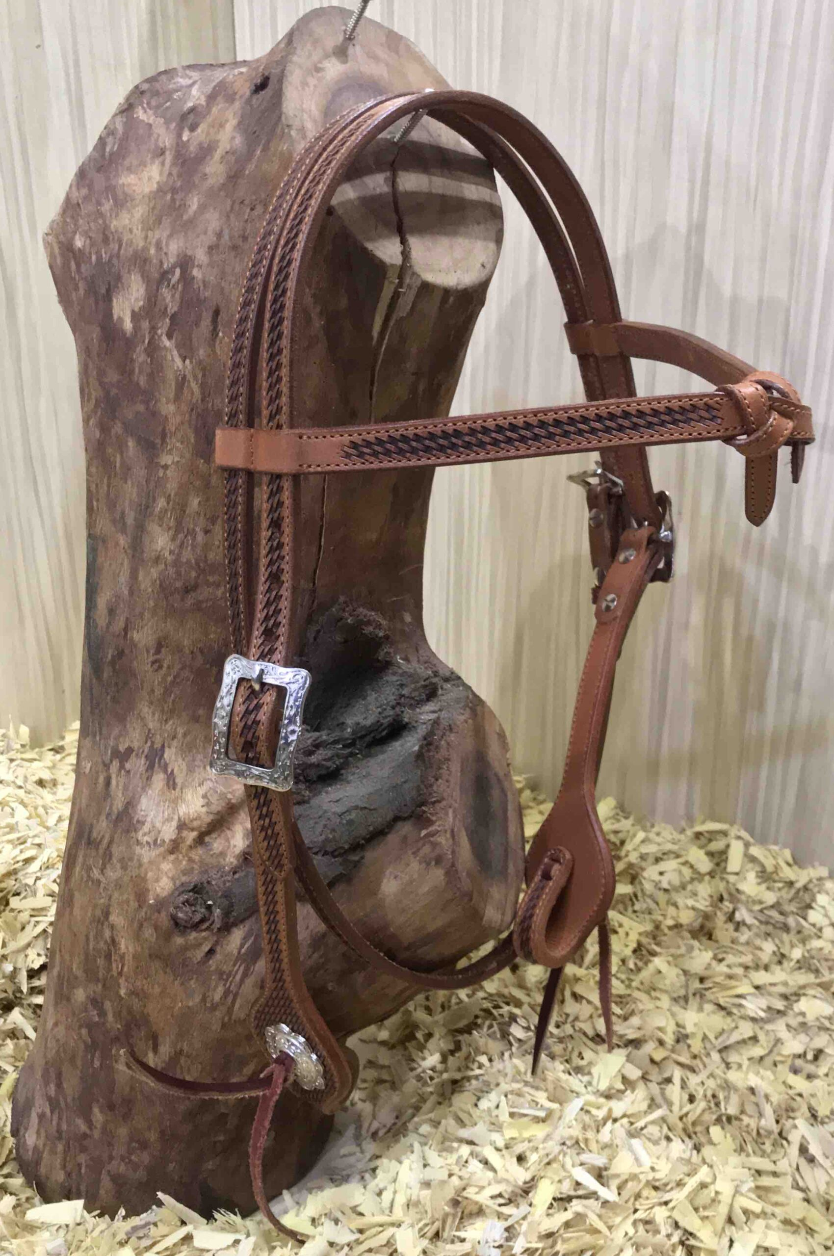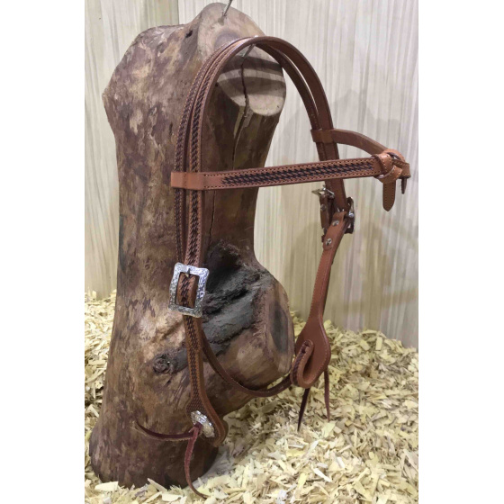 Kožená uzdečka s čelenkou zdobená jemným basketem a končaky. Podšitá jemnou telecí kůží, ozdobné prošití po obvodu.