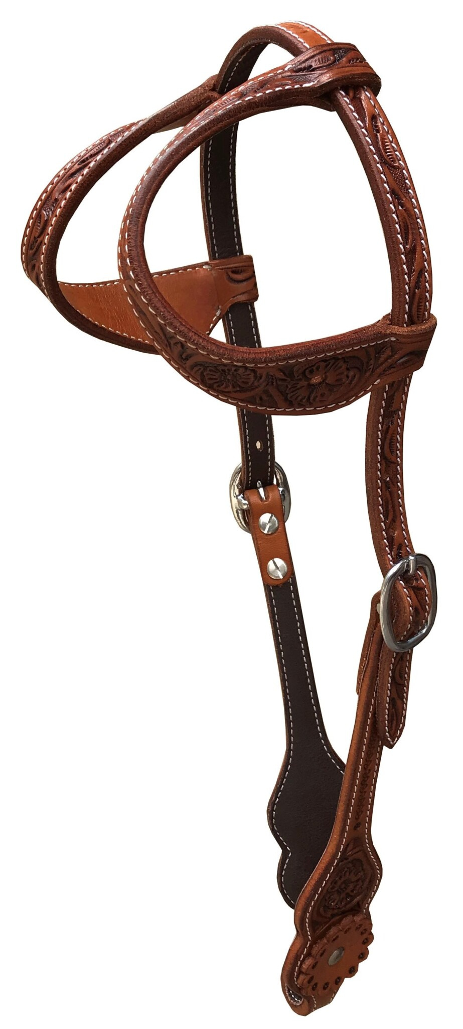 Kožená uzdečka na dvě uši zdobená vytlačeným vzorem, možnost doplnění končakem na šroubek na náušnících. Podšitá jemnou telecí kůží, ozdobné prošití po obvodu.