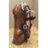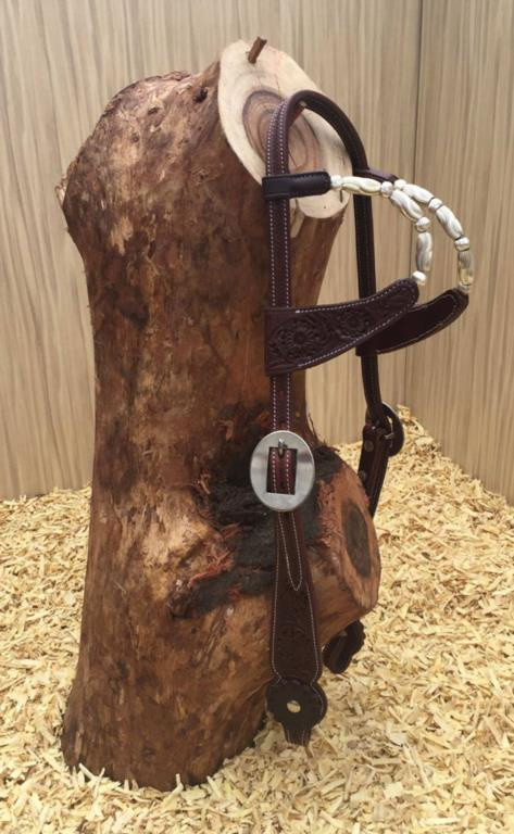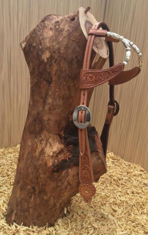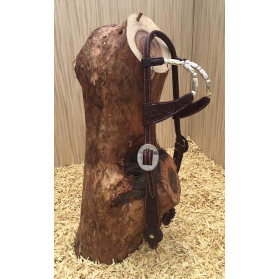 Kožená uzdečka Cattlemans na dvě uši zdobená vytlačeným vzorem a stříbrnými válečky a kuličkami. Podšitá jemnou telecí kůží, ozdobné prošití po obvodu.
