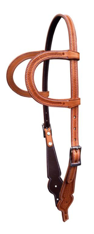Kožená uzdečka na dvě uši Wickett & Craig zdobená jemným basketem a koženým končakem. Podšitá jemnou telecí kůží, ozdobné prošití po obvodu. Řemínky pro udidlo nutno objednat zvlášť.
