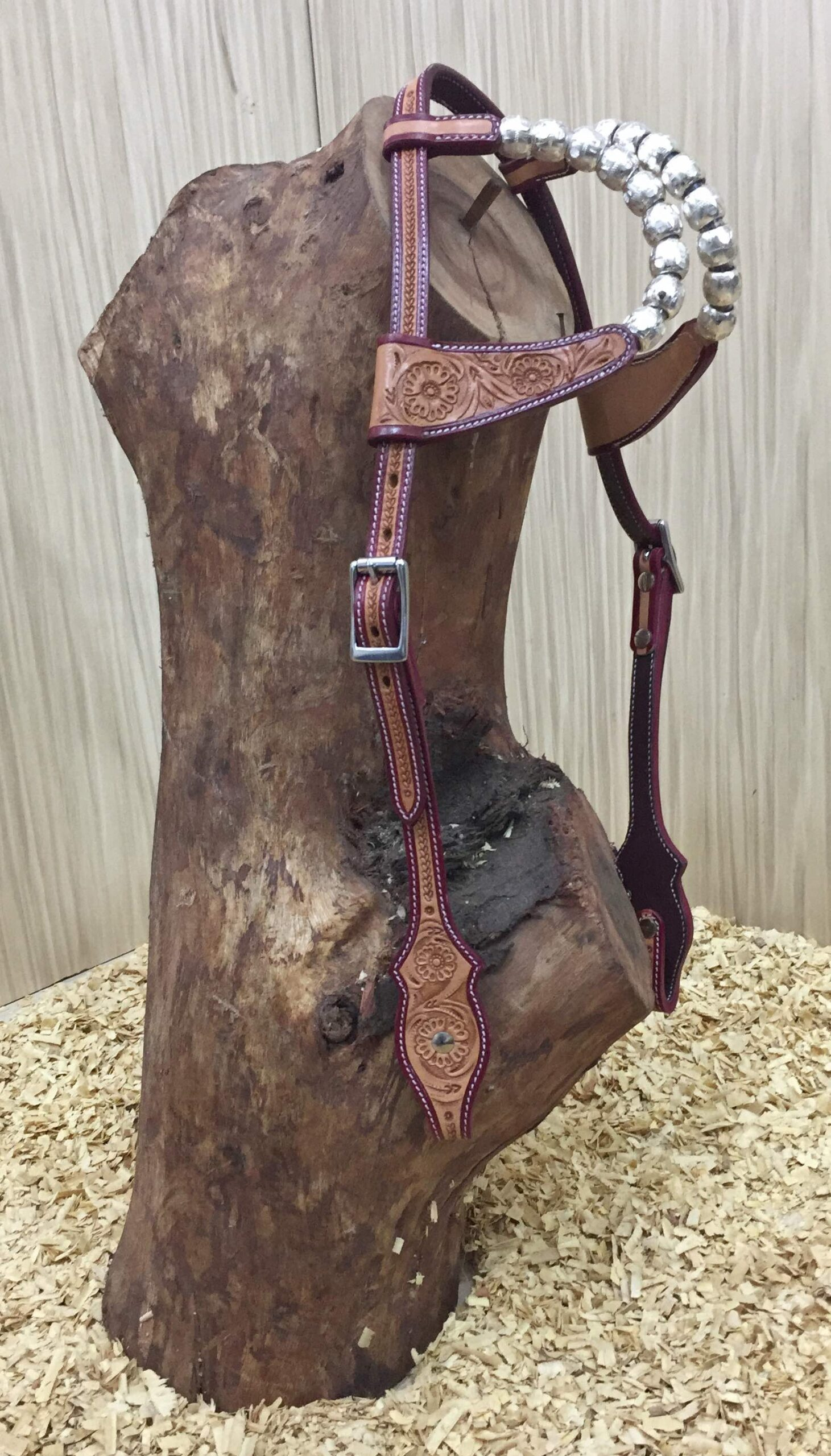 Kožená dvoubarevná uzdečka na dvě uši zdobená květinovým vzorem a stříbrnými kuličkami. Podšitá jemnou telecí kůží, ozdobné prošití po obvodu.