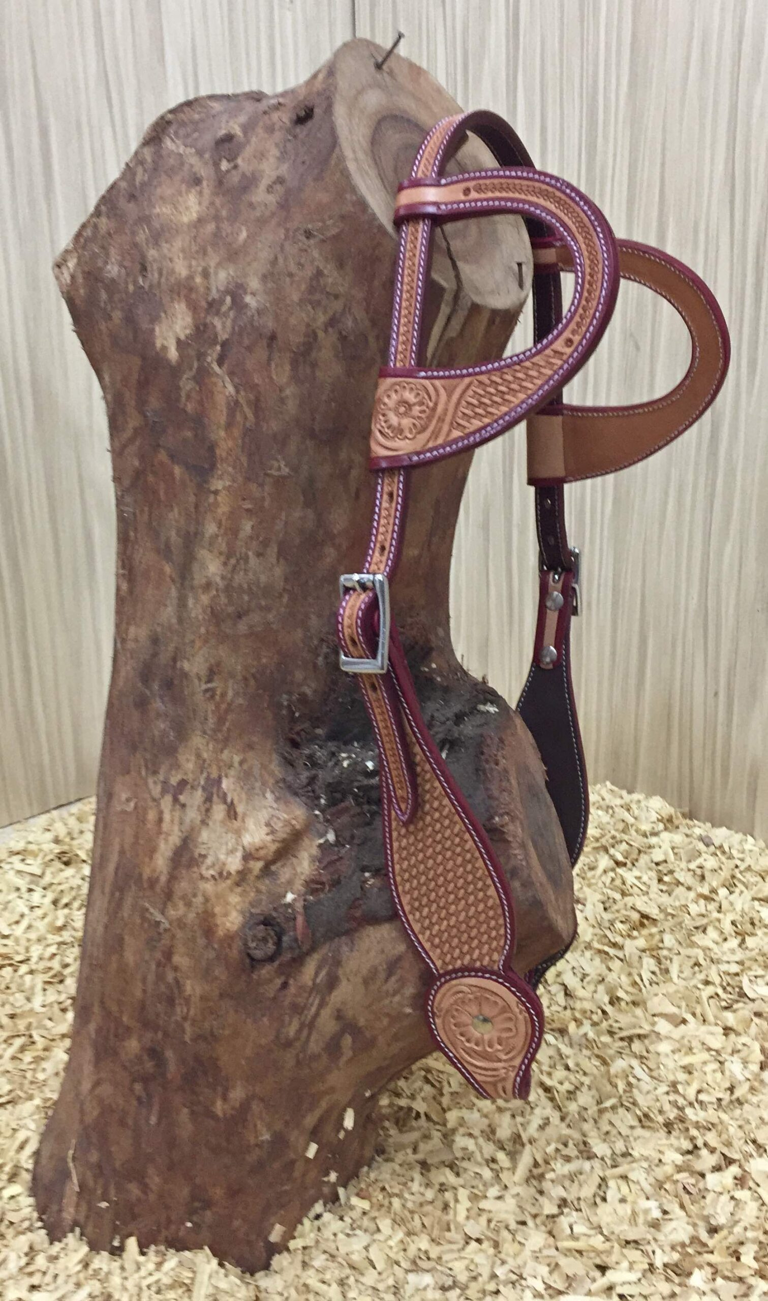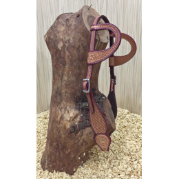 Kožená dvoubarevná uzdečka na dvě uši zdobená květinovým vzorem a jemným basketem. Podšitá jemnou telecí kůží, ozdobné prošití po obvodu.