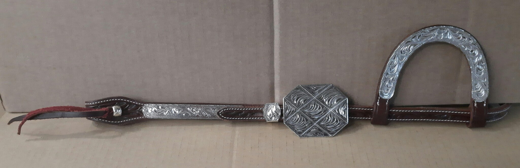 Kožená show uzdečka na dvě uši zdobená květinovým vzorem, stříbrnými přezkami a dalšími stříbrnými doplňky. Podšitá jemnou telecí kůží, ozdobné prošití po obvodu.