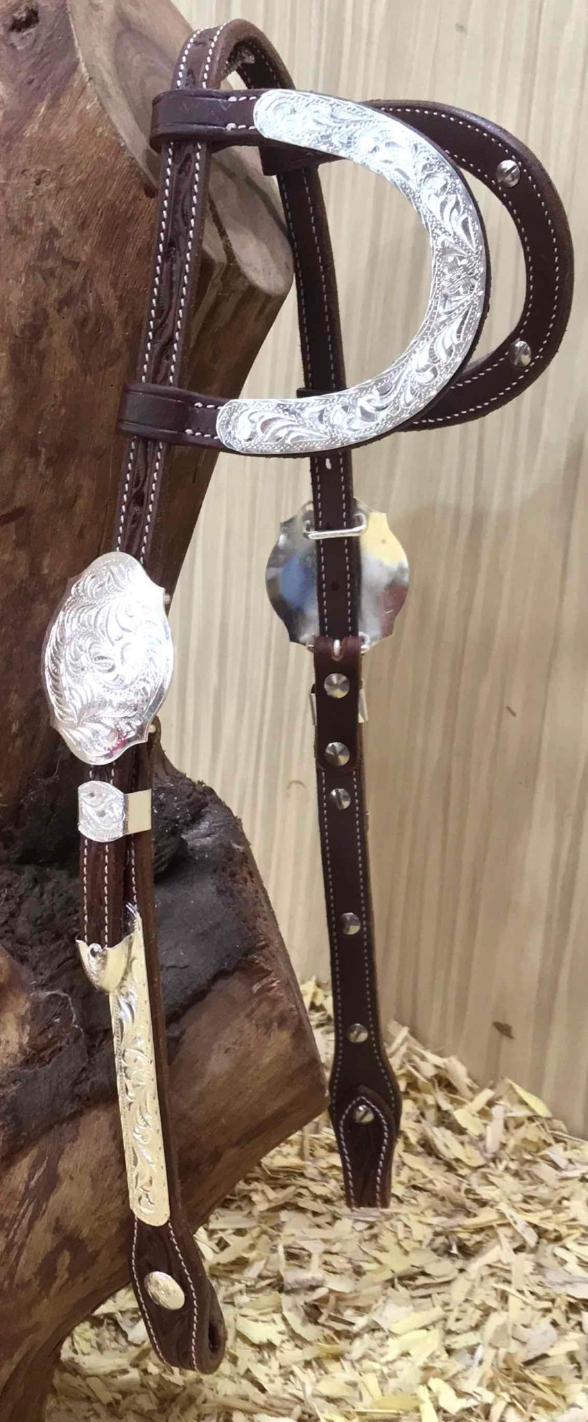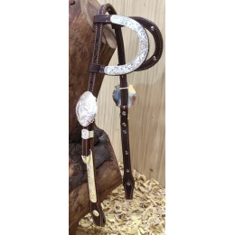 Kožená show uzdečka na dvě uši zdobená květinovým vzorem, stříbrné přezky a další doplňky. Podšitá jemnou telecí kůží, ozdobné prošití po obvodu.