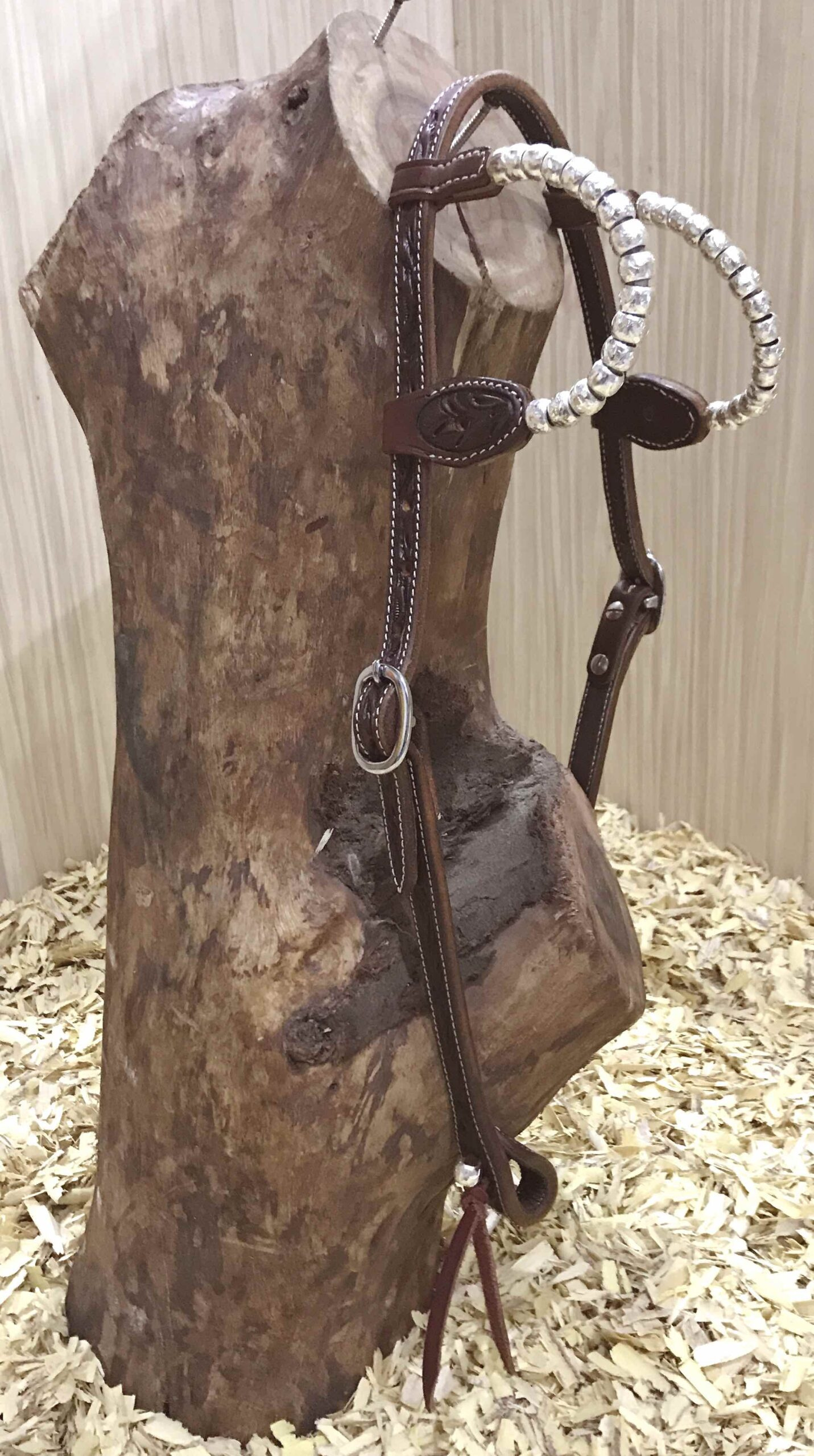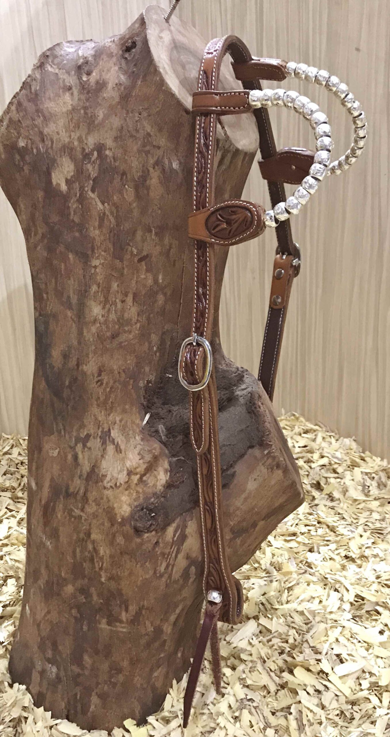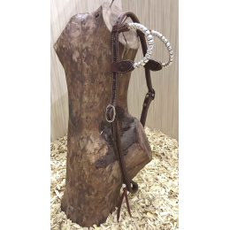 Kožená uzdečka na dvě uši zdobená vytlačeným vzorem a stříbrnými válečky a kuličkami, nerezové kování. Podšitá jemnou telecí kůží, ozdobné prošití po obvodu.