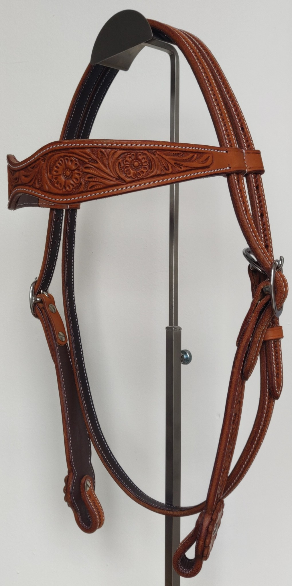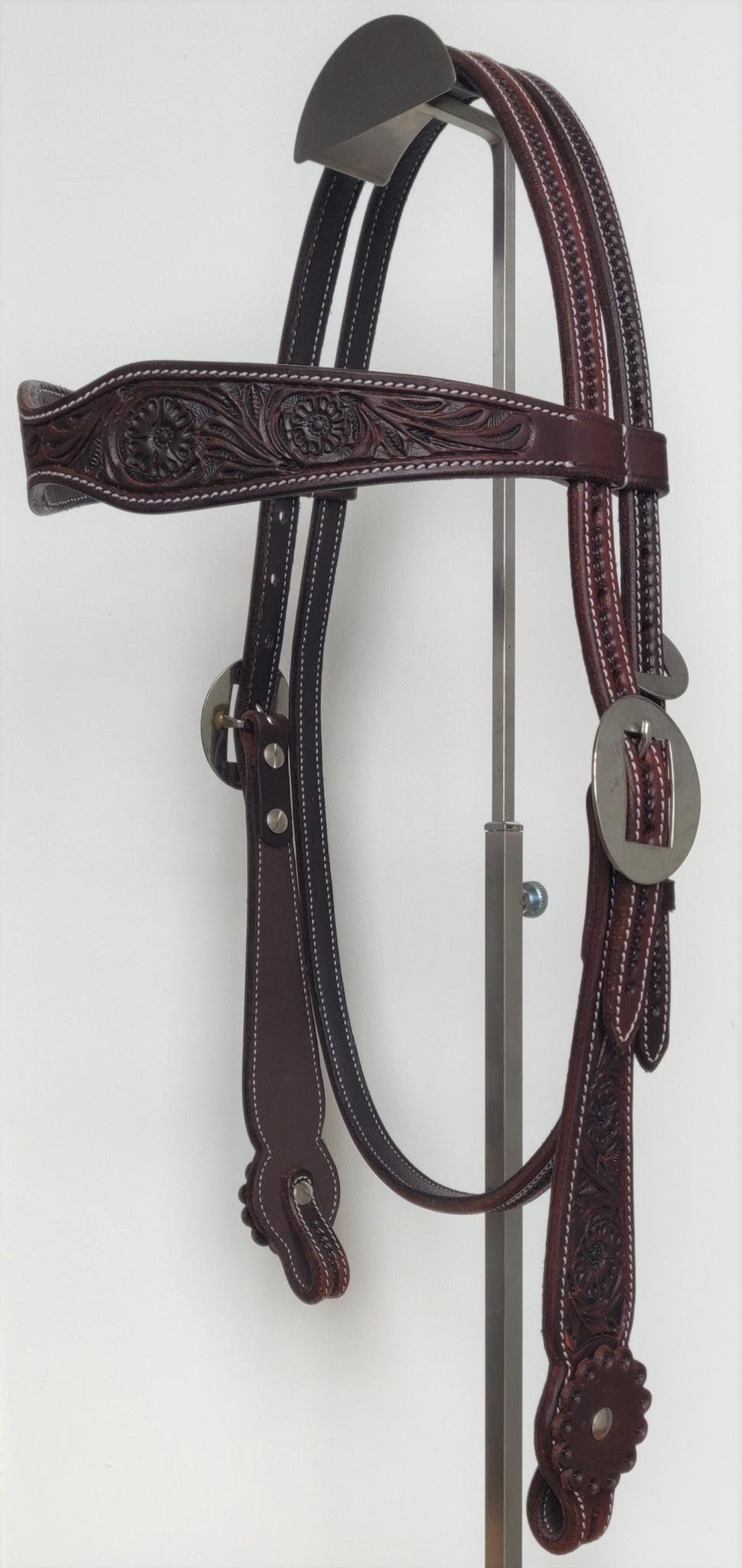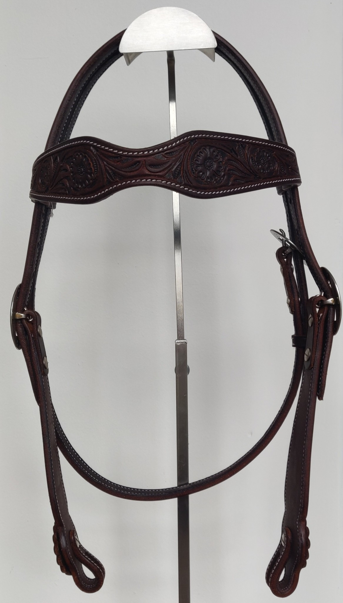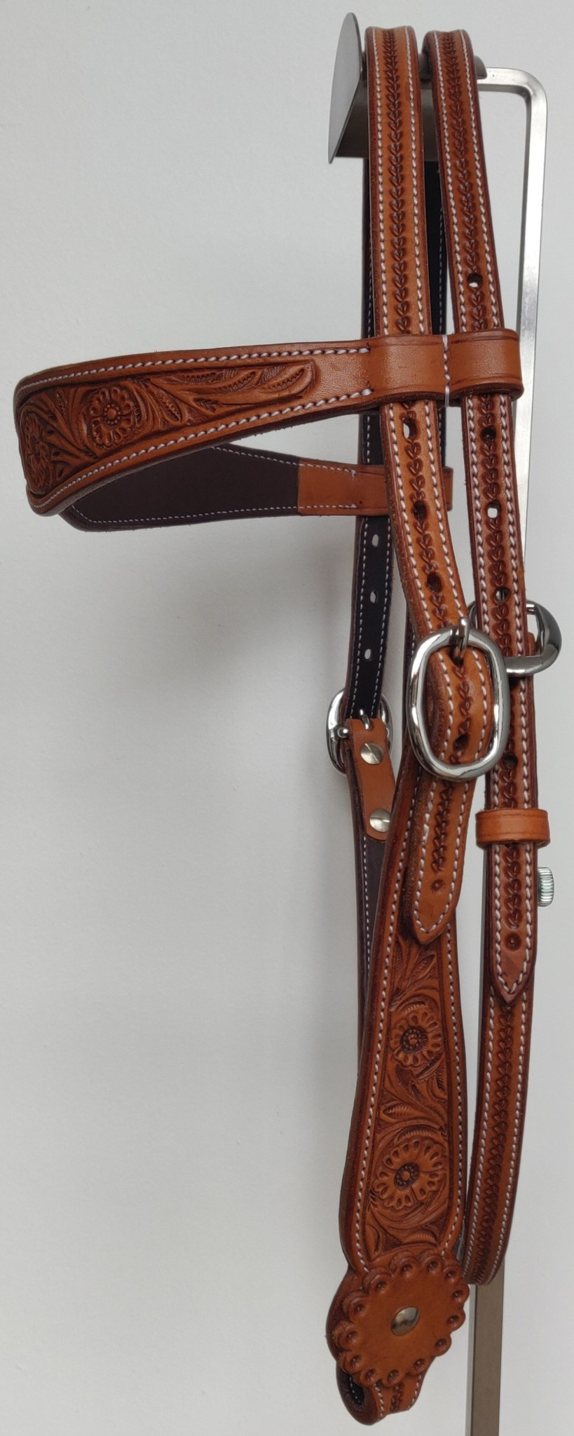 Kožená uzdečka s tvarovanou čelenkou zdobená květinovým vzorem. Podšitá jemnou telecí kůží, ozdobné prošití po obvodu.