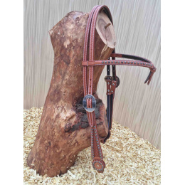 Vysoce kvalitní kožená uzdečka s čelenkou zdobená basketem, nýtky a koženým končakem. Podšitá jemnou telecí kůží, ozdobné prošití po obvodu.