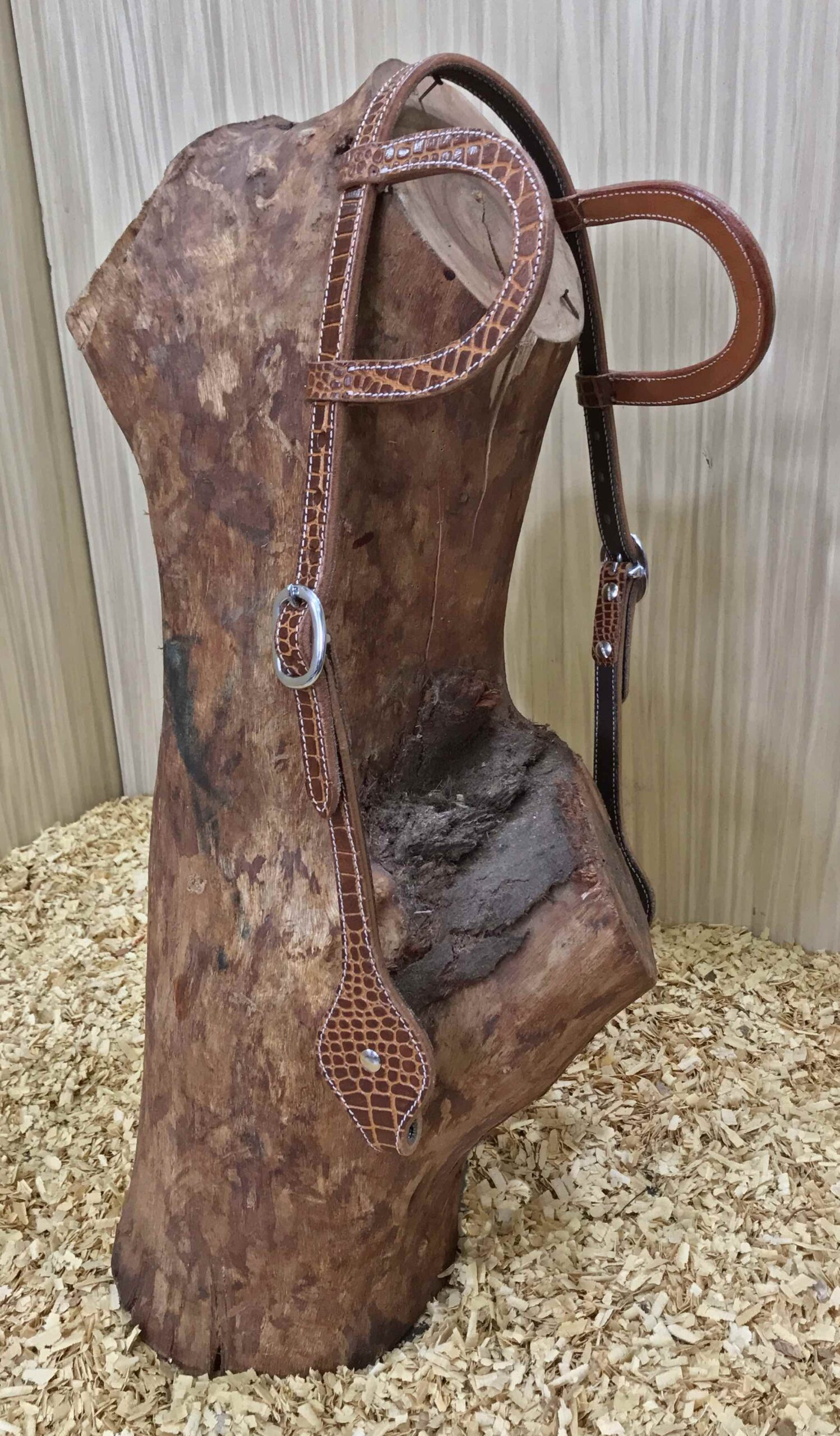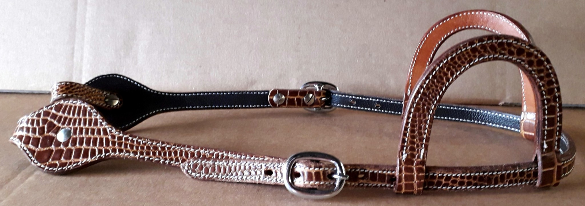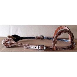 Kožená uzdečka na dvě uši s imitací krokodýlí kůže. Podšitá jemnou telecí kůží, ozdobné prošití po obvodu.