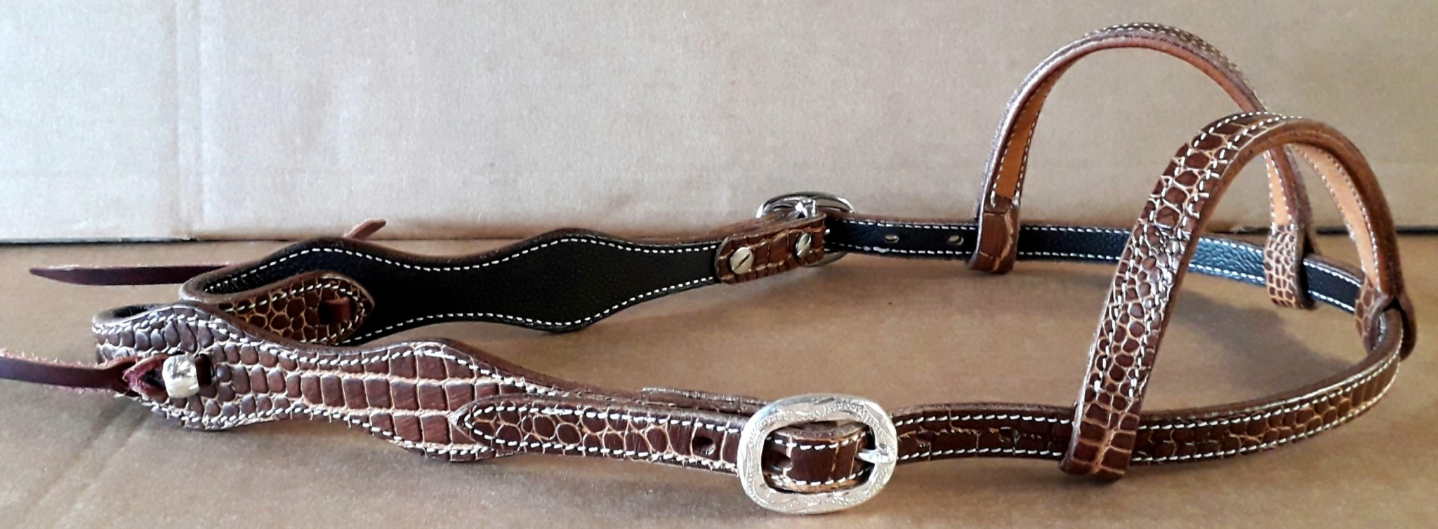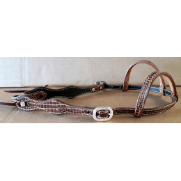 Kožená uzdečka na dvě uši s imitací krokodýlí kůže zdobená stříbrnou přezkou a stříbrným korálkem. Podšitá jemnou telecí kůží, ozdobné prošití po obvodu.