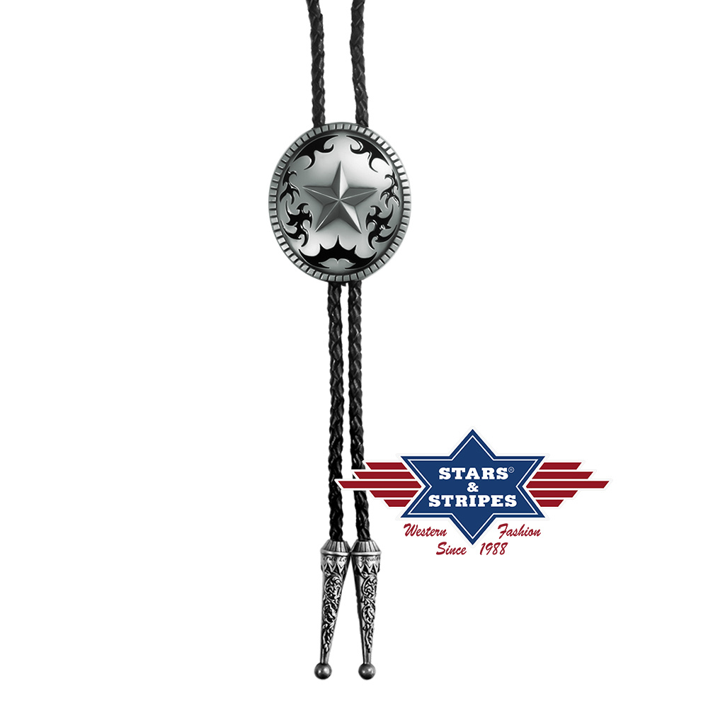 Stylové bolo, westernová náhrada kravaty, s originálním motivem. Tento doplněk nesmí chybět v šatníku žádného milovníka drsného chopper/western stylu. Na zadní straně jsou bola opatřena klipsou pro snadné nastavení délky kolem krku na černé pletené šňůrce.