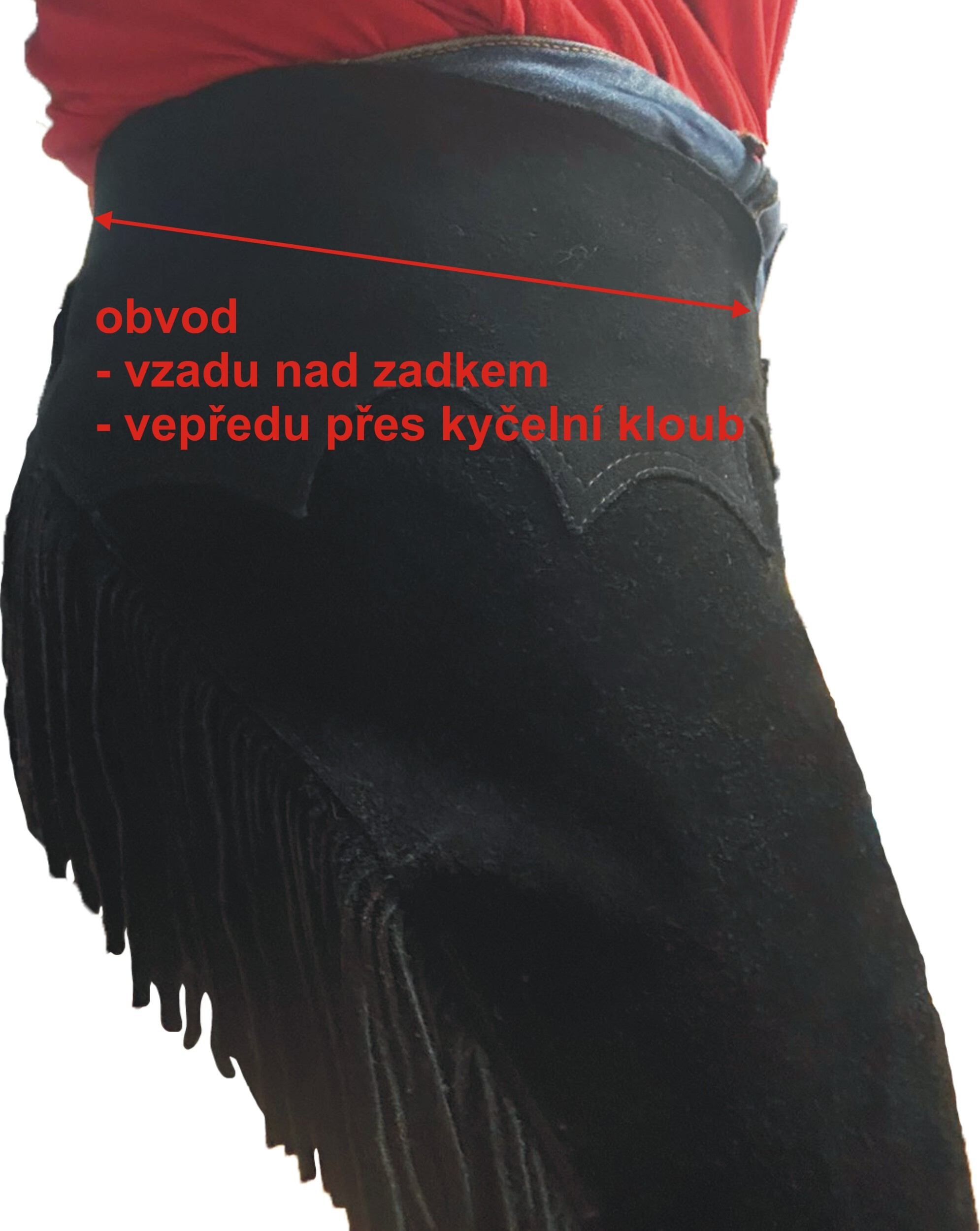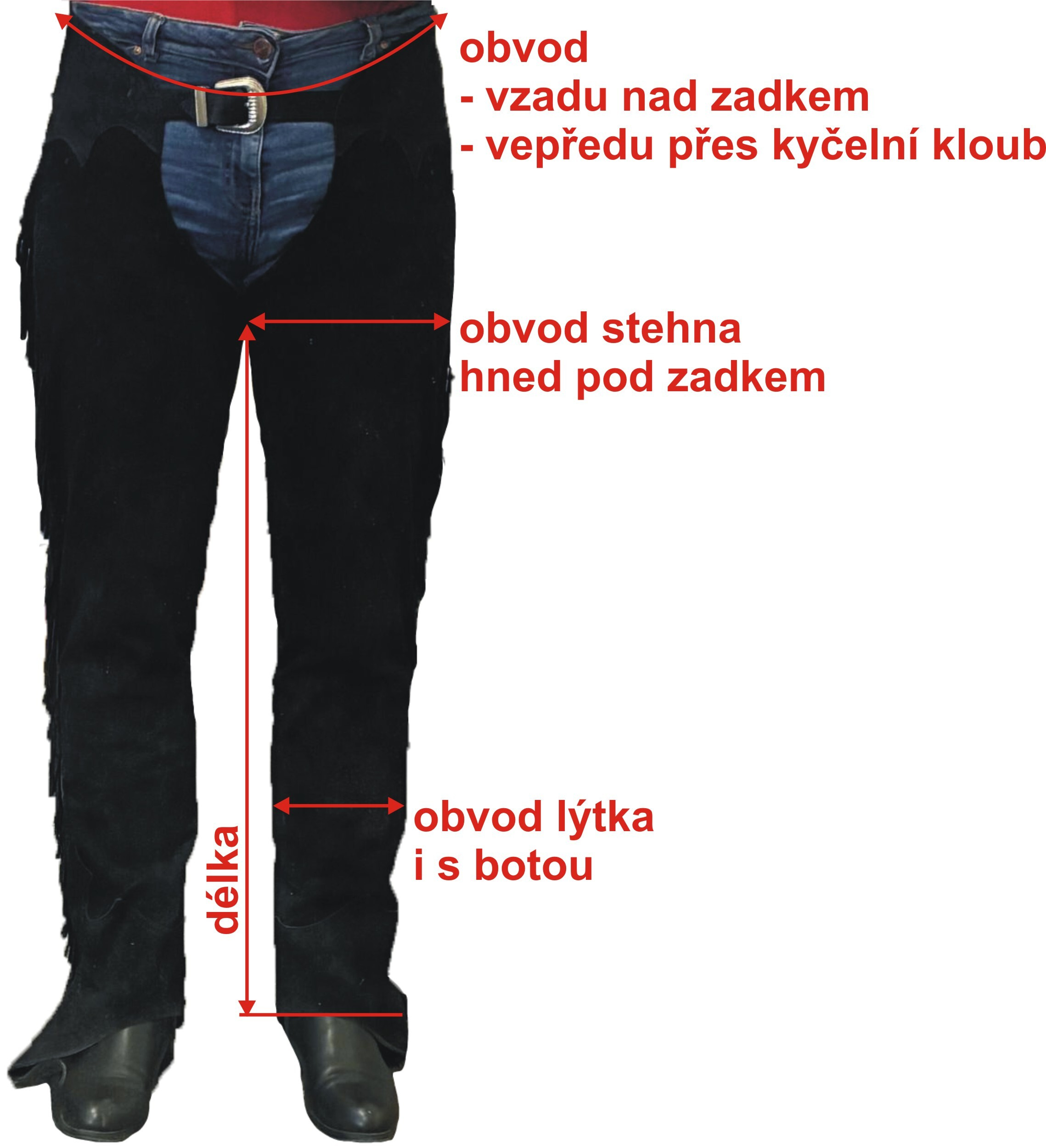 Míry pro výrobu chapsů měřte prosím v oblečení a botách, ve kterých jezdíte (rifle, rajtky, westernová pracovní obuv, koně, perka ap.). Měřte čistou míru, bez přidaných rezerv dle níže popsaných obrázků.