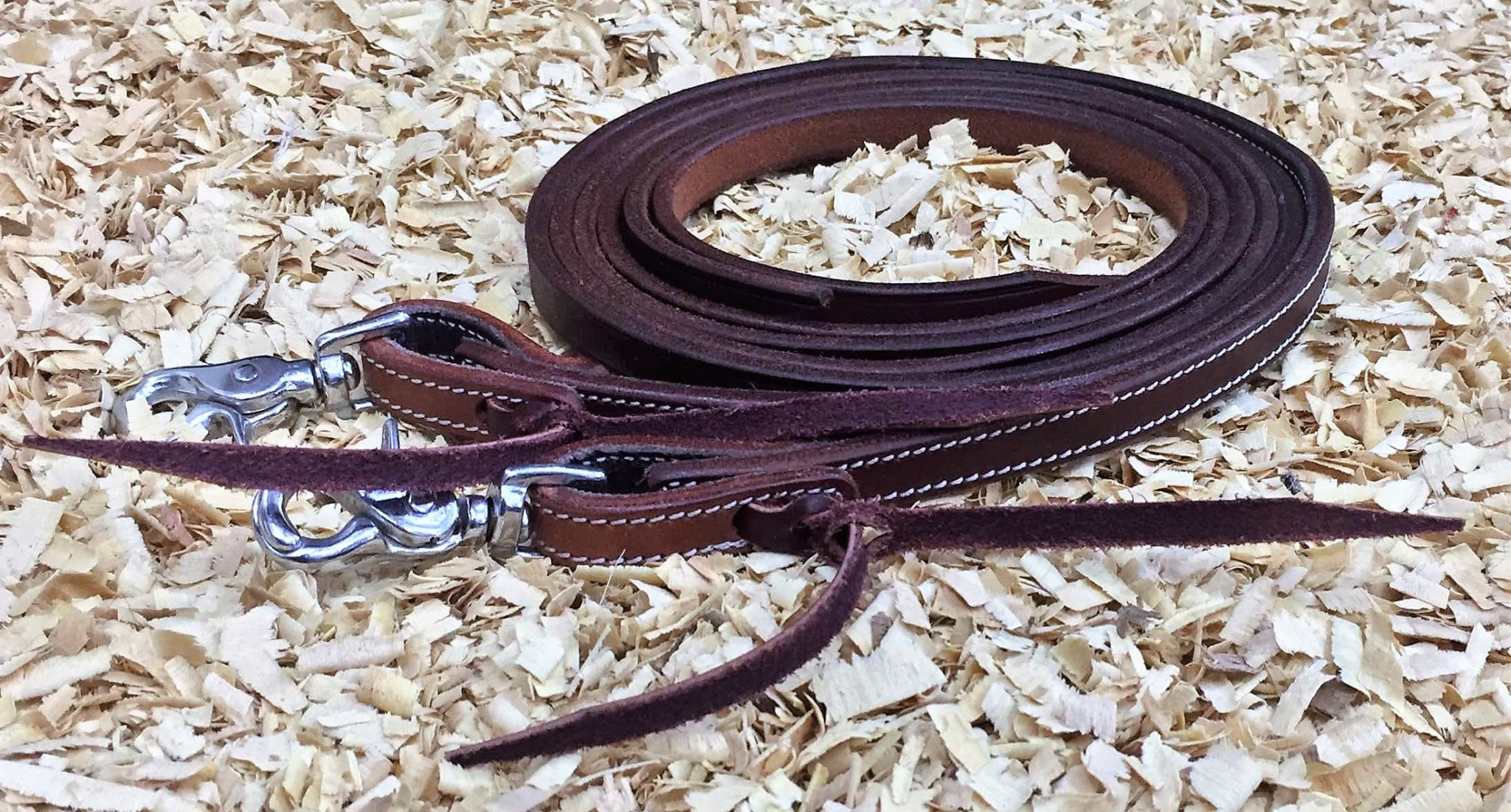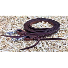 Kožené westernové otěže, prošité, se zapínáním na přezky, velmi pevné, přesto dobře ohebné, pružné a padnoucí do ruky.