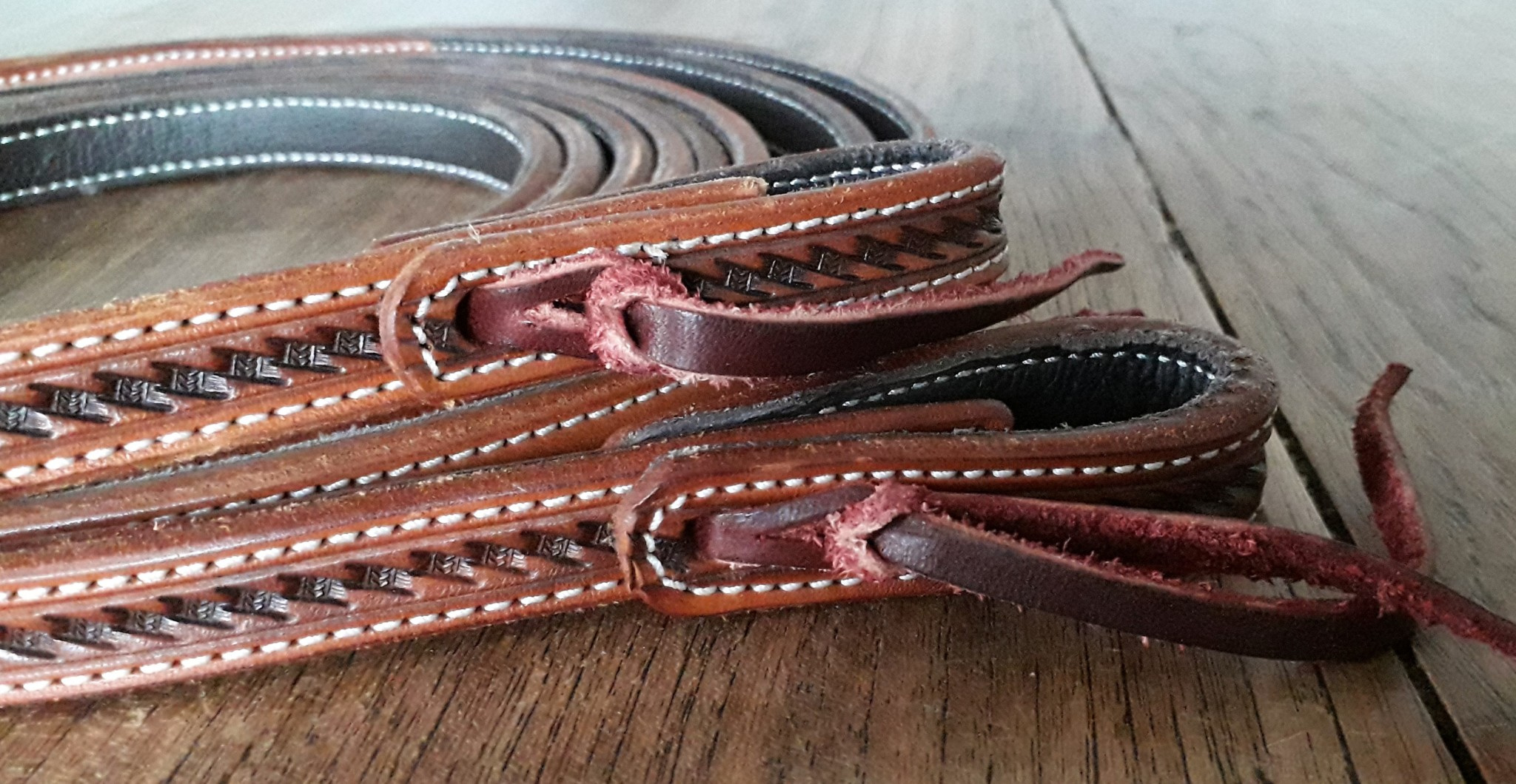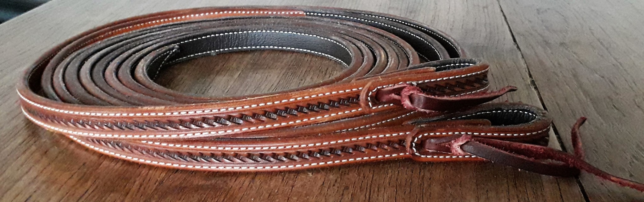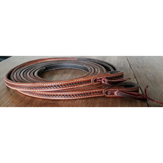 Kožené westernové otěže GVR z výběrové kůže Sadesa zdobené basketem, prošité, velmi pevné, přesto dobře ohebné, pružné a padnoucí do ruky.