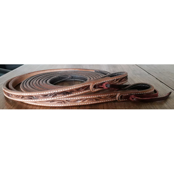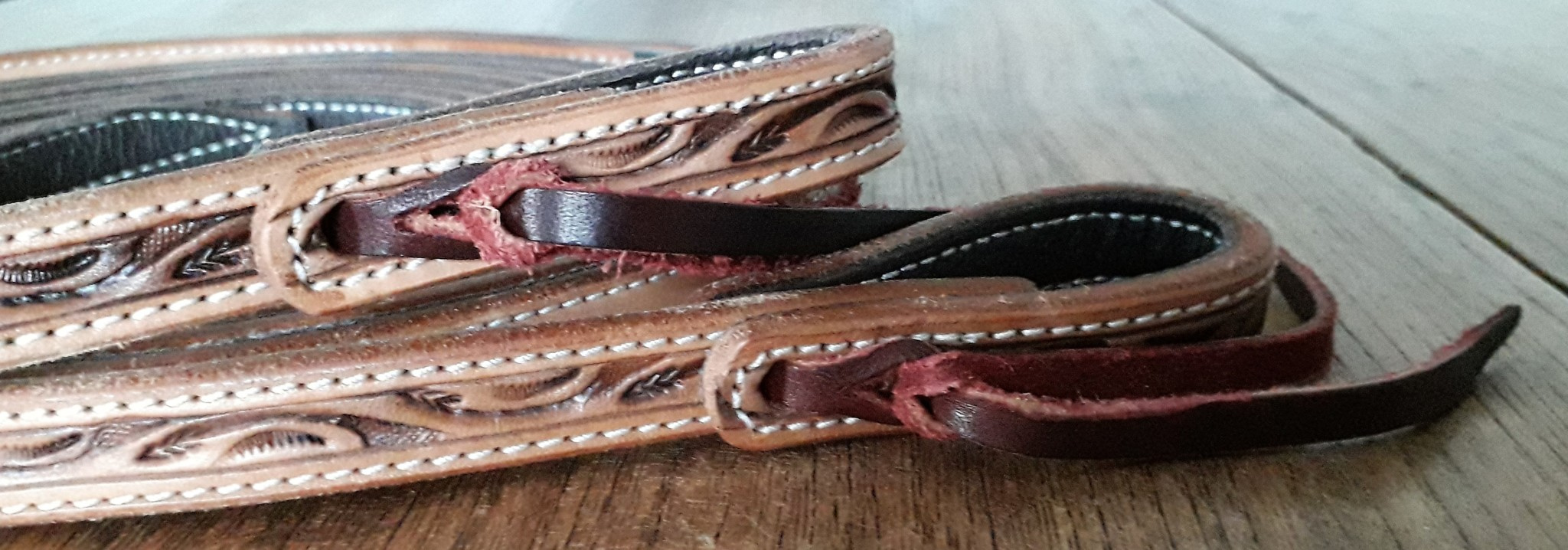 Kožené westernové otěže GVR z výběrové kůže Sadesa zdobené listovým vzorem, prošité, velmi pevné, přesto dobře ohebné, pružné a padnoucí do ruky.