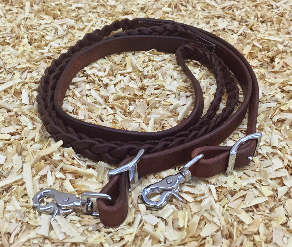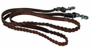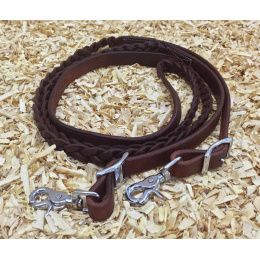 Nedělené kožené westernové otěže Wickett & Craig, částečně pletené, se zapínáním na přezky, velmi pevné, přesto dobře ohebné, pružné a padnoucí do ruky.