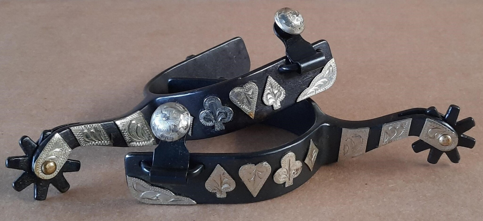 Černé ocelové ostruhy s ručně rytým stříbrným zdobením s karetním motivem. Kolečko s osmi paprsky.